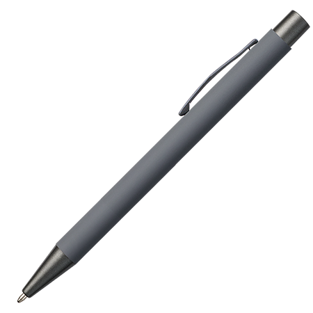 Der JAMAICA Metall-Kugelschreiber hat ein stilvolles Rubber-Finish und ist mit anthrazitfarbenen Details (Drücker, Clip und Spitze) versehen. Der Stift kann mit Lasergravur personalisiert werden und ist blauschreibend.