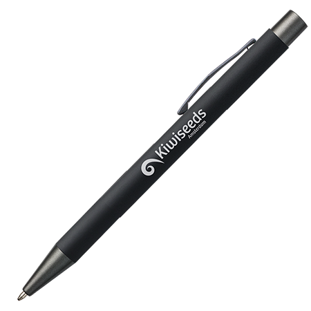 Der JAMAICA Metall-Kugelschreiber hat ein stilvolles Rubber-Finish und ist mit anthrazitfarbenen Details (Drücker, Clip und Spitze) versehen. Der Stift kann mit Lasergravur personalisiert werden und ist blauschreibend.