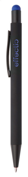Aluminium-Kugelschreiber mit Touchpen und gummierter Oberfläche und Spezialbeschichtung für eine Farbgravur (Gravurfarbe abgestimmt mit Stylus), blauschreibend.