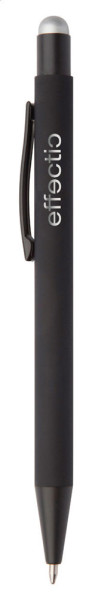 Aluminium-Kugelschreiber mit Touchpen und gummierter Oberfläche und Spezialbeschichtung für eine Farbgravur (Gravurfarbe abgestimmt mit Stylus), blauschreibend.