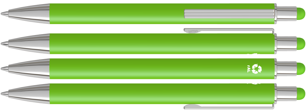 Metall-Druckkugelschreiber mit matter Oberfläche aus recyceltem Aluminium. Metallclip mit eingelassenen Rillen, Metallspitze in silber glänzend und Drücker mit integrierter Touchscreensteuerung.