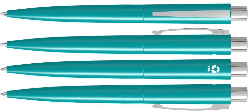 Metall-Druckkugelschreiber mit matt lackiertem Gehäuse aus recyceltem Aluminium. Metallclip und Drücker glanzverchromt.