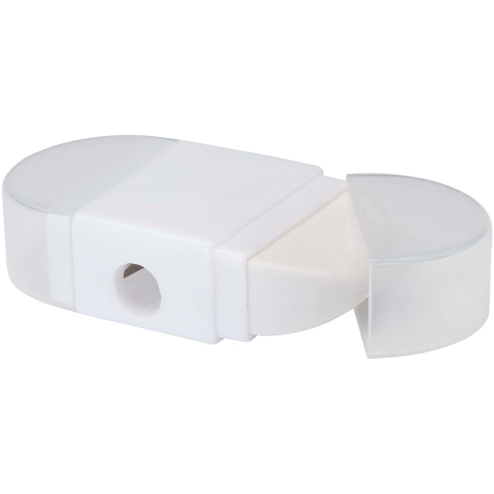 Bleistiftspitzer mit Radiergummi mit durchsichtigen Kappen auf beiden Seiten. Größe 6,2 x 3,3 x 1,6 cm.