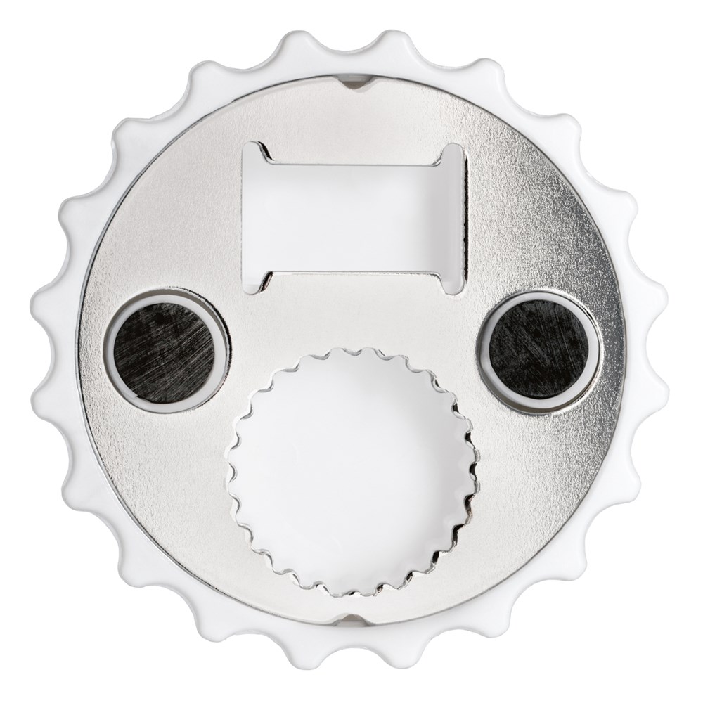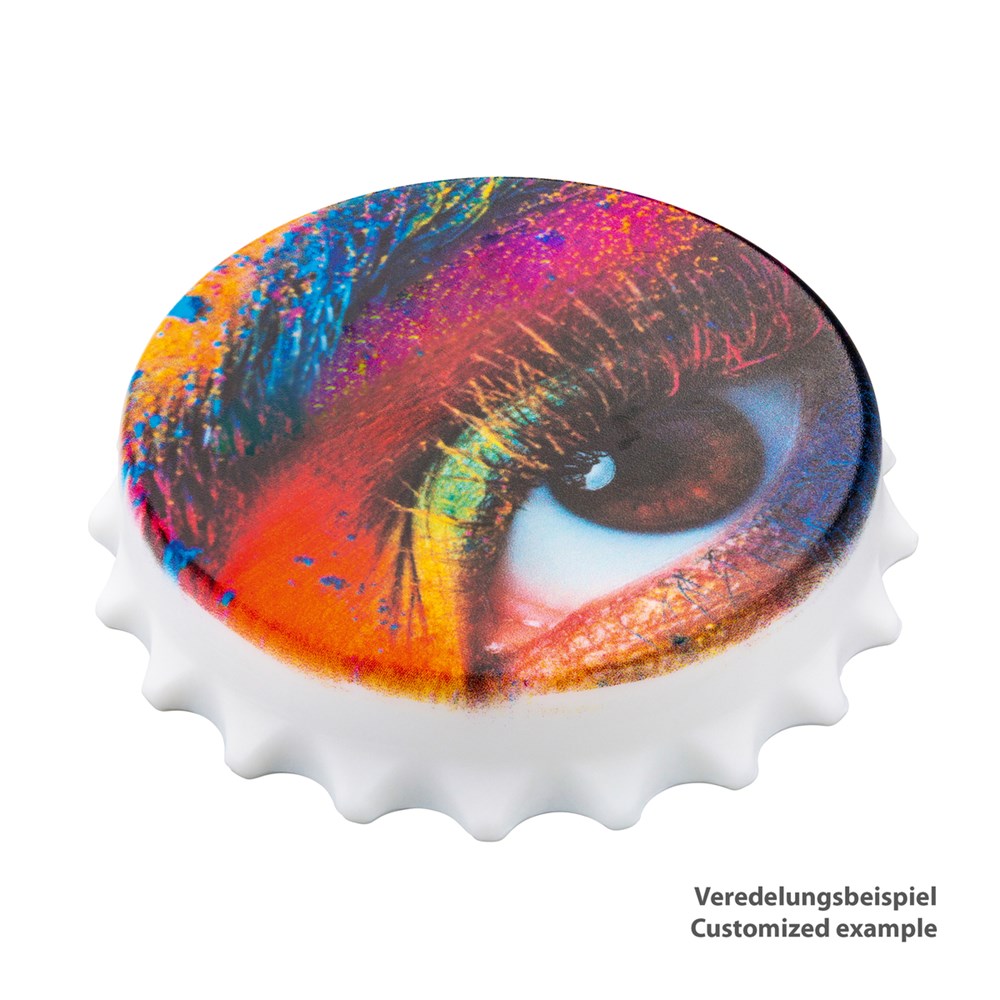 Der Flaschenöffner mit Kühlschrankmagnet in Kronkorkenform ist perfekt als preiswerter Onpack-Artikel, Hingucker am Getränkekühlschrank in Kantinen und Warteräumen oder kleiner Zugabeartikel zum Getränke-Goodie. Ihre ganz persönliche Werbebotschaft hat viel Platz auf der großzügigen Werbefläche und wirkt besonders gut als UV-Druck.