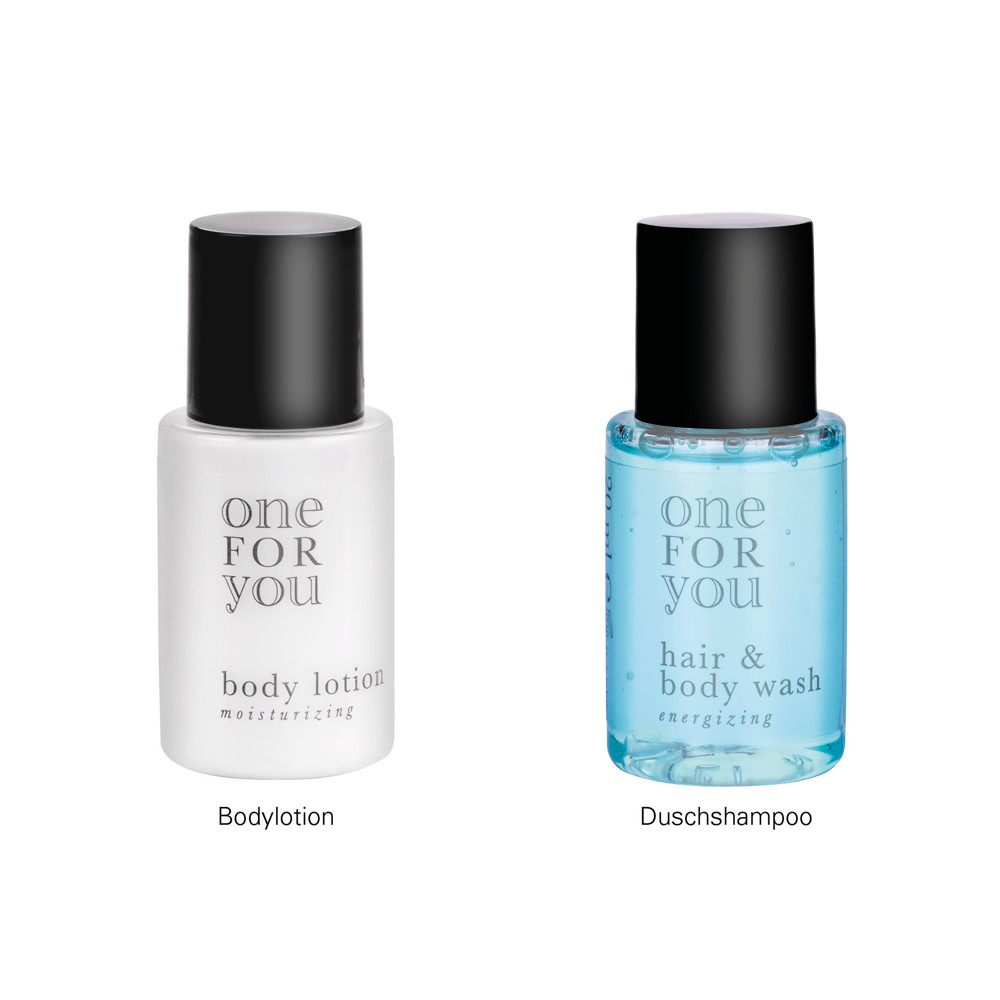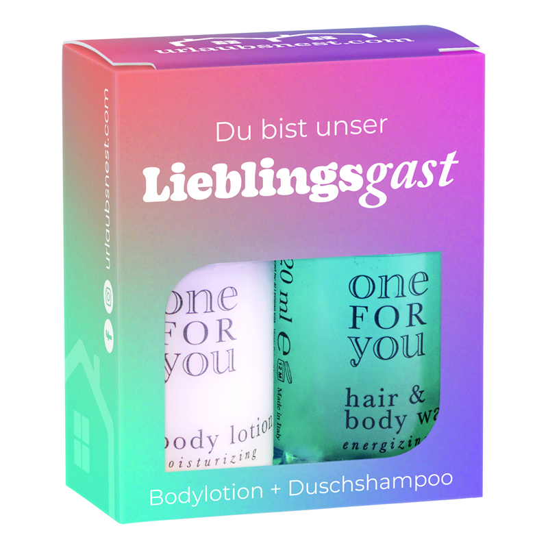 Werbebox aus weißem Karton, mir einem großen Sichtfenster, individuell bedruckt. Inhalt: 1 Set aus je 1 Bodylotion und 2-in-1-Duschshampoo mit aromatischem, blumigen, holzigem und moschusartigem Duft, 40 ml, 40 ml