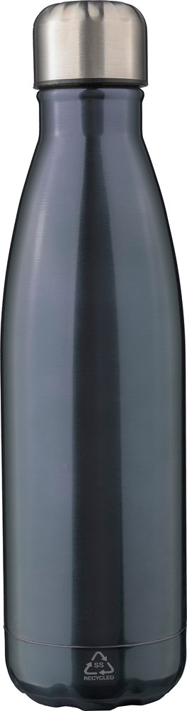 Doppelwandige Flasche aus recyceltem Edelstahl (500 ml) mit Schraubverschluss. Das Innere der Flasche besteht aus Edelstahl 304, das Äußere aus Edelstahl 201. Das Recycelt-Logo ist auf dem Kolben eingraviert. Einzeln verpackt in einer braunen Pappschachtel.