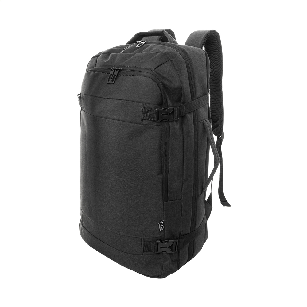 RPET-Rucksack mit Doppelfunktion und Dokumententasche mit 2 Reißverschlussfächern, Reißverschluss-Vortasche und gepolstertem Laptopfach (15"). Mit Anti-Diebstahl-Tasche, Trolley-Gurt, gepolstertem Rücken und Schultergurten. Material: 600D RPET-Polyester. Mit RPET-Label.