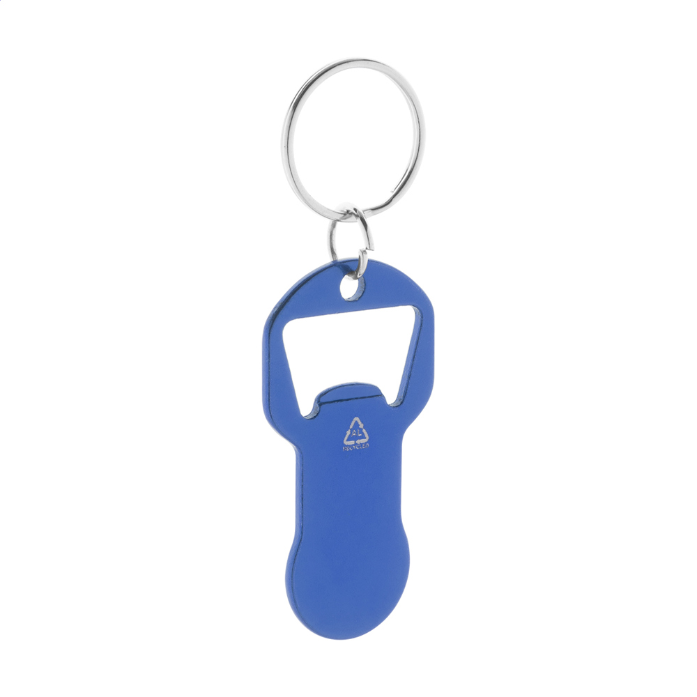 Schlüsselanhänger aus recyceltem Aluminium mit Flaschenöffner und Einkaufswagenchip. mehr