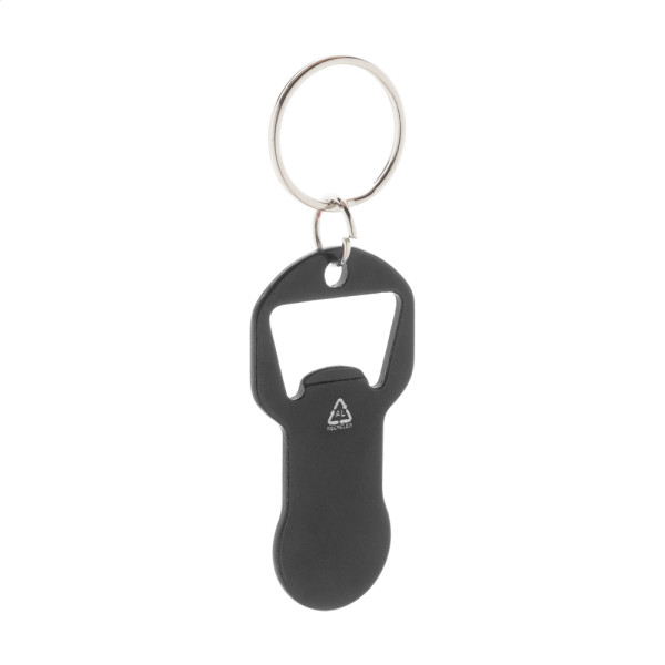 Schlüsselanhänger aus recyceltem Aluminium mit Flaschenöffner und Einkaufswagenchip.