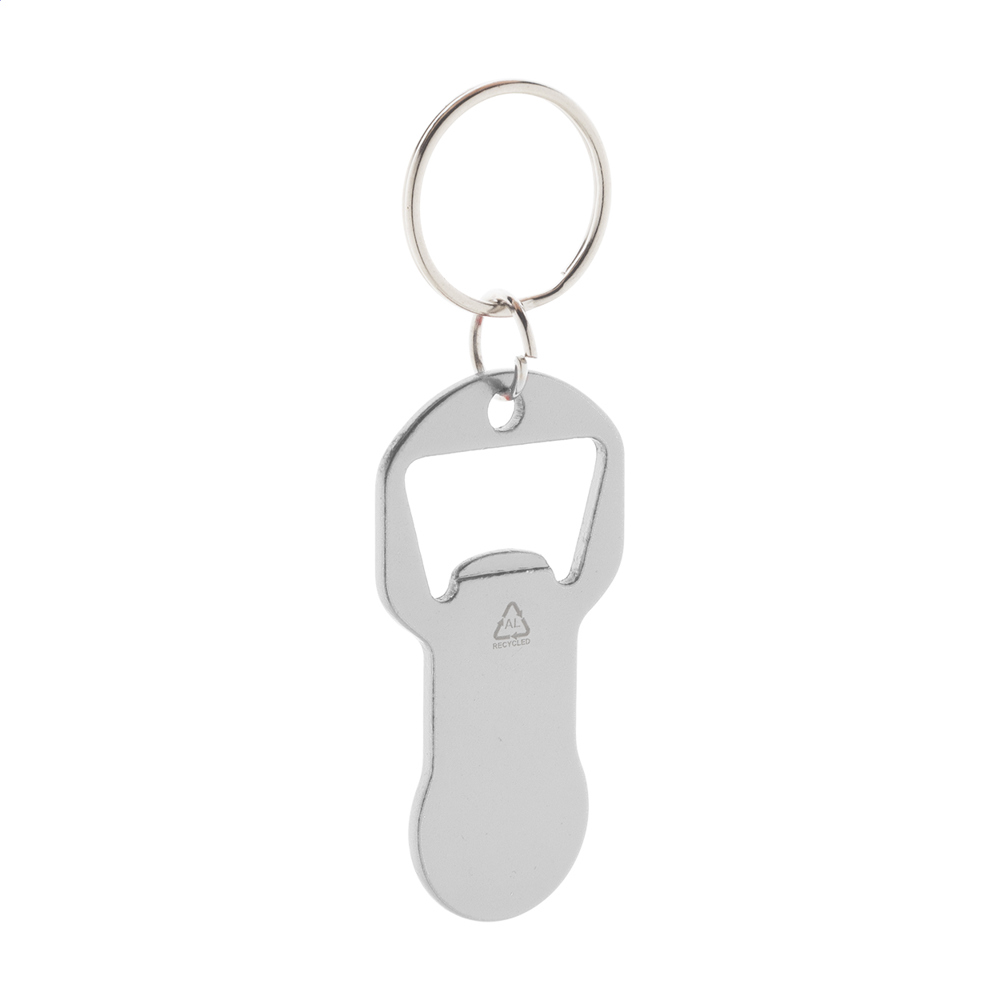Schlüsselanhänger aus recyceltem Aluminium mit Flaschenöffner und Einkaufswagenchip.