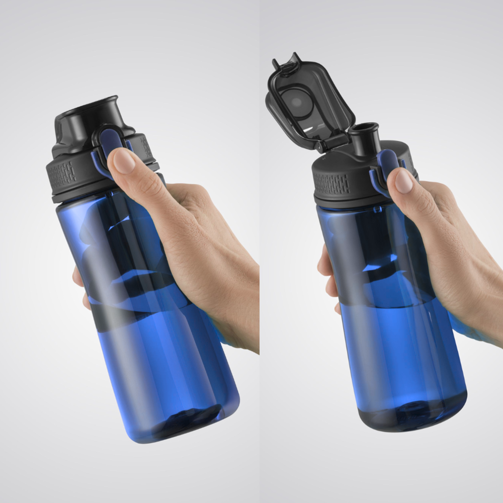 Das innovative Design umfasst einen praktischen Ein-Klick-Öffnungsmechanismus für schnellen und einfachen Zugriff auf Ihr Getränk. Wenn Sie die Flasche nicht verwenden, können Sie den Verschluss verschließen, um ein Auslaufen des Inhalts zu verhindern. Durch die breite Öffnung können Sie Eiswürfel hineinlegen. Aus praktischen Gründen ist die Flasche außerdem mit einem Materialgriff ausgestattet.