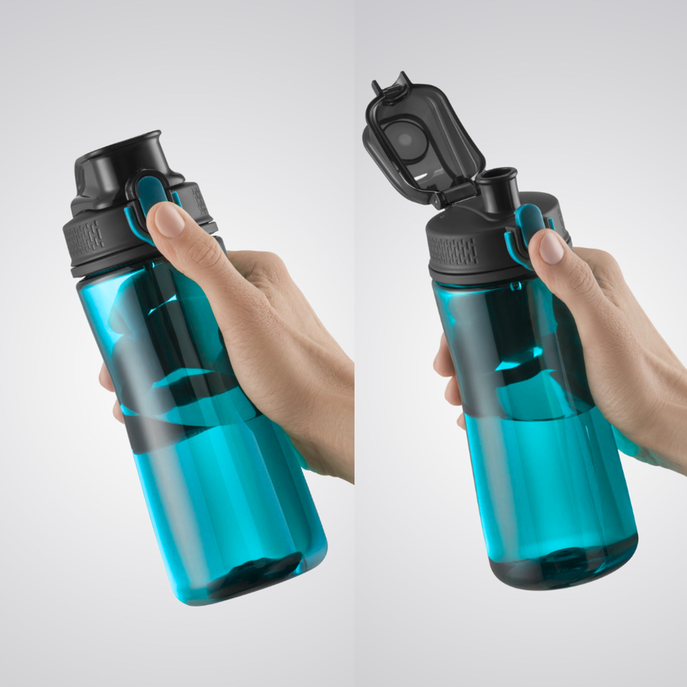 Das innovative Design umfasst einen praktischen Ein-Klick-Öffnungsmechanismus für schnellen und einfachen Zugriff auf Ihr Getränk. Wenn Sie die Flasche nicht verwenden, können Sie den Verschluss verschließen, um ein Auslaufen des Inhalts zu verhindern. Durch die breite Öffnung können Sie Eiswürfel hineinlegen. Aus praktischen Gründen ist die Flasche außerdem mit einem Materialgriff ausgestattet.