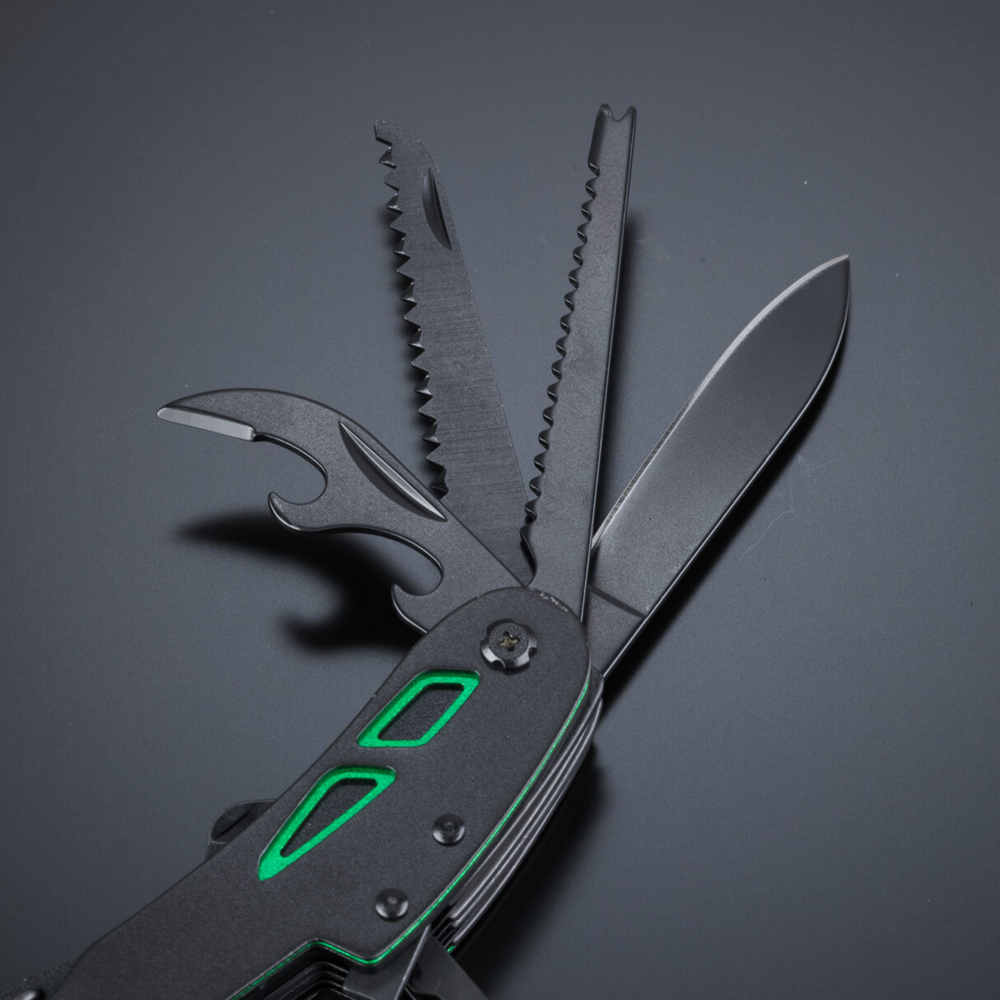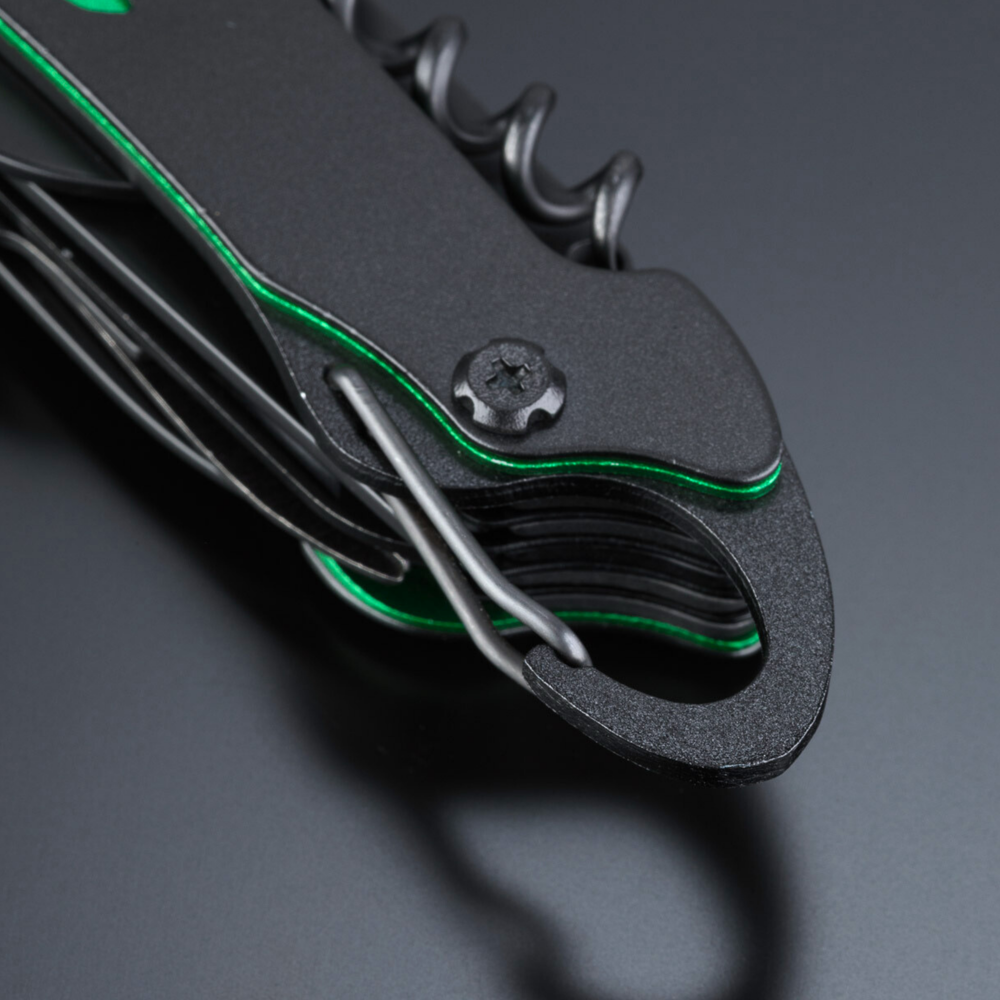 Optima-Taschenmesser im neuen Gewand, hergestellt aus hochwertigem Edelstahl mit Titanbeschichtung für verbesserte Härte und zusätzliche Korrosionsbeständigkeit. Bunte Einsätze am Griff zur dezenten Verzierung. Hauptmerkmale: Schere, Messer, Holzsäge, Flaschen- und Dosenöffner, Fischschaber, Korkenzieher, Locher (zum Durchstechen von z. B. einer Saftdose), Einfädler (zum Flicken von Schläuchen, Nähen von Segelflößen, Flicken eines Reifens), Nagelfeile, Kreuzschlitzschraubendreher. Das Taschenmesser mündet in einen Karabiner, sodass Sie es immer dabei haben können.