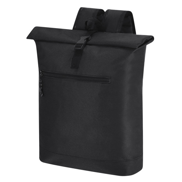 Rucksack aus widerstandsfähigem 600D RPET-Polyester. Hat ein Hauptfach mit einem Schnallenverschluss und einem gepolsterten Fach für Laptops bis zu 15 Zoll sowie eine zusätzliche Fronttasche mit Reißverschluss. Die Schultergurte sind gepolstert und verstellbar. RPET-Logo am Etikett und Zubehör in Schwarz. Das RPET-Material wird aus recyceltem Kunststoff hergestellt, um die Wiederverwendung von Plastikabfällen zu fördern und zur Nachhaltigkeit des Planeten beizutragen.