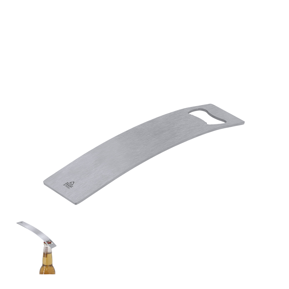 Flaschenöffner aus recyceltem Edelstahl. Enthält das Zeichen für recycelten Edelstahl.Edelstahl ist eines der am meisten nachgefragten Materialien und ist fast überall zu finden, von Alltagsprodukten bis hin zu Großkonstruktionen. Mit unzähligen Eigenschaften, unter denen Haltbarkeit und hohe Wiederverwendbarkeit hervorzuheben sind, macht es zu einer sehr geschätzten Alternative in nachhaltigen Lösungen. Bei richtiger Behandlung ermöglicht es die Gewinnung neuer Ressourcen mit unendlicher Verwendung.