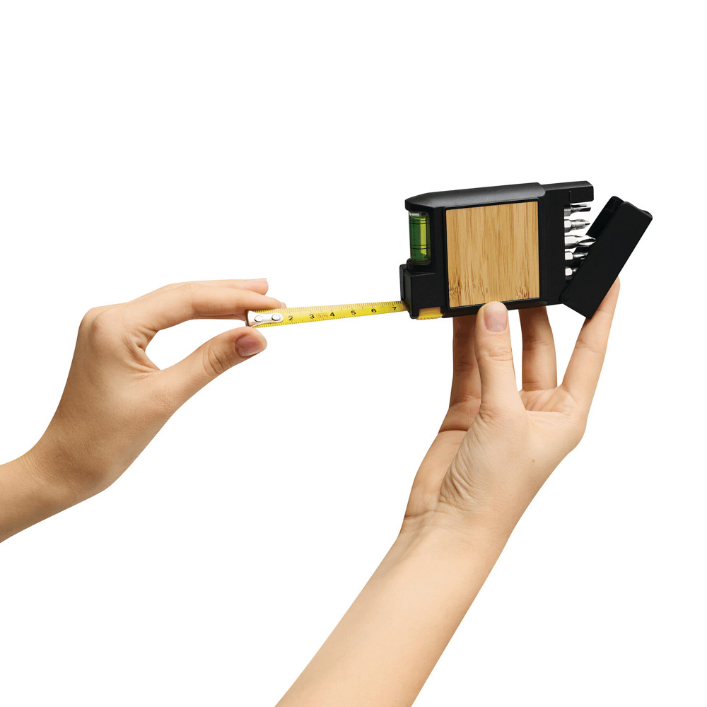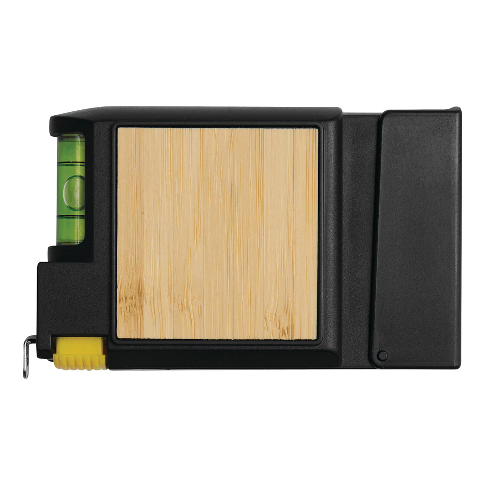 Maßband SCREWY: mit Einrollfunktion, Wasserwaage und Schraubendreher mit 5 verschiedenen Bits, Bambus-Platte für die Veredelung, 3 m