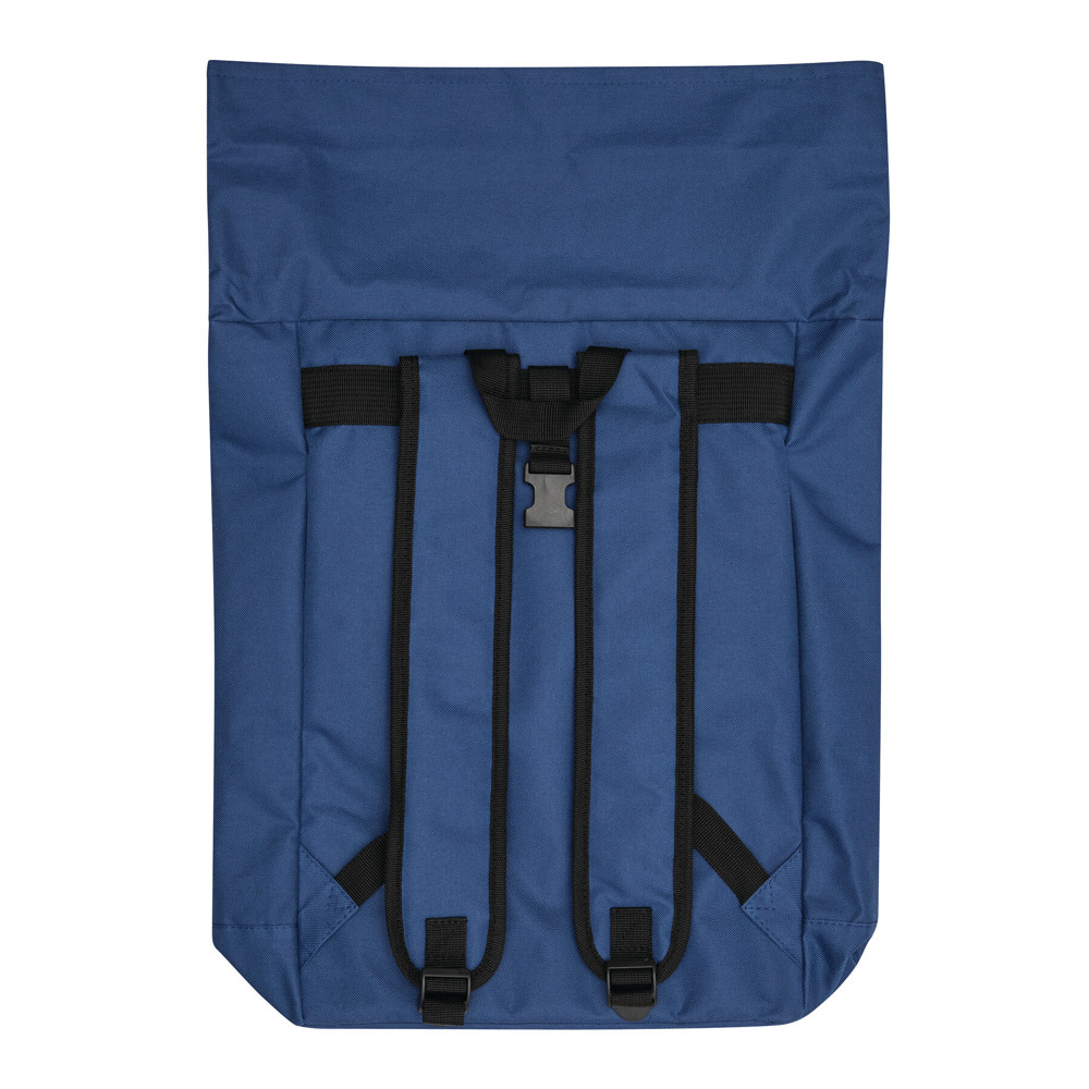 Rucksack ROLL-TOP: aus recyceltem Kunststoff (RPET), horizontales Reißverschluss-Vorfach, großes Hauptfach mit gepolstertem Innenfach für Laptop oder Tablet, aufrollbar und mit Schnappverschluss verschließbar, Trageschlaufe, gepolsterter Boden, Schultergurte und Rückenbereich