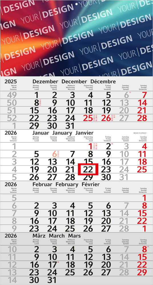 Der Budget 4 Bestseller ist ein besonders preiswerter 4-Monatskalender, der sich durch modernes Design und praktische Funktionalität auszeichnet. Mit einem klar strukturierten Kalendarium, farblich hervorgehobenen Sonn- und Feiertagen sowie einer großzügigen Werbefläche kombiniert er Übersichtlichkeit mit effektiver Markenpräsentation. Ideal für Unternehmen, die ein vielseitiges und hochwertiges Werbemittel suchen.