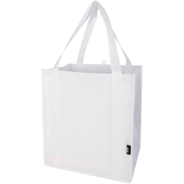 Die Liberty Tragetasche aus GRS-zertifiziertem Recyclingmaterial besteht aus strapazierfähigem und reißfestem RPET-Non Woven und verfügt über einen harten Boden, der sie vielseitig und stabil macht. Die Tasche hat ein großes Hauptfach und 25 cm lange Tragegriffe. Fassungsvermögen: 29 Liter. Beständigkeit bis zu 12 kg.