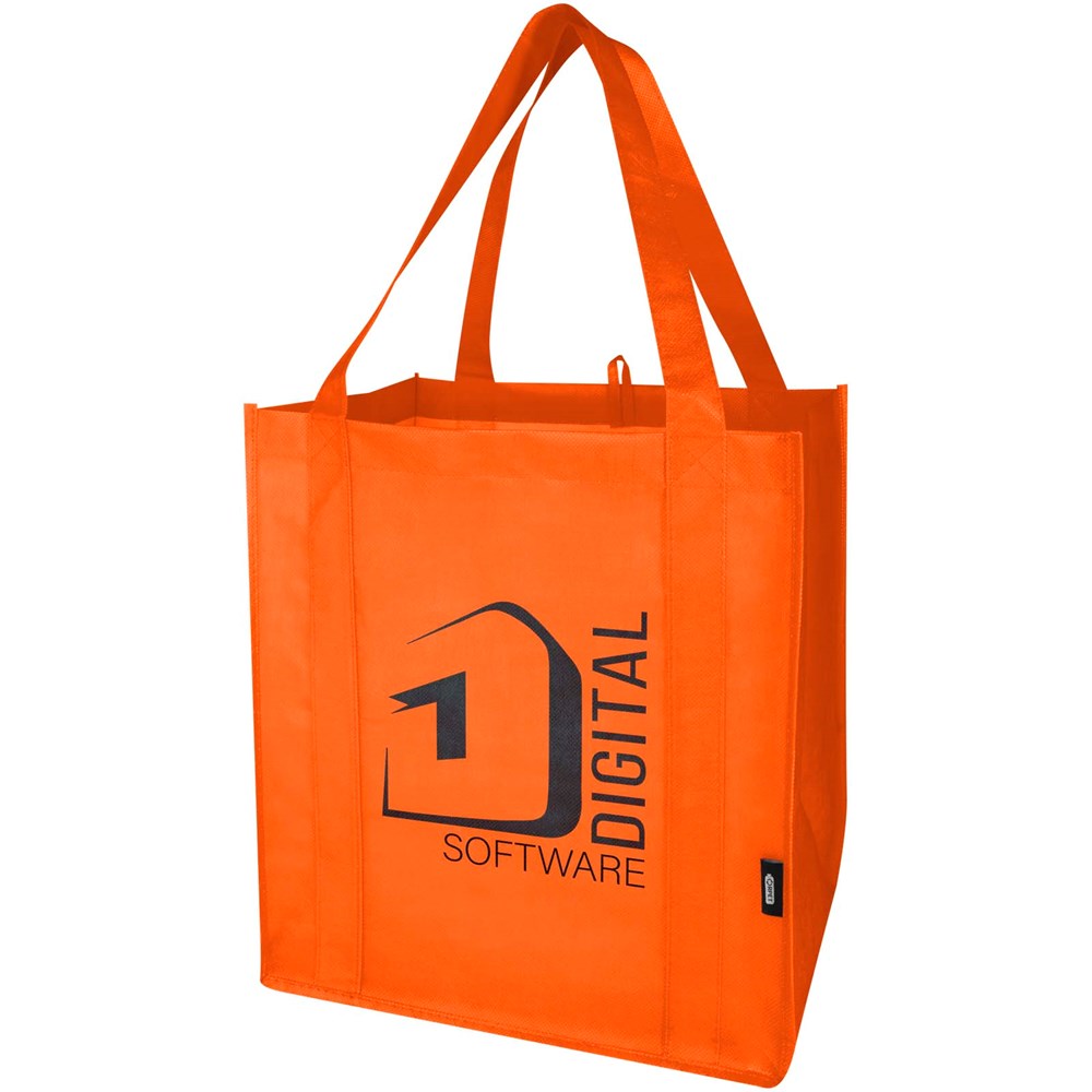 Die Liberty Tragetasche aus GRS-zertifiziertem Recyclingmaterial besteht aus strapazierfähigem und reißfestem RPET-Non Woven und verfügt über einen harten Boden, der sie vielseitig und stabil macht. Die Tasche hat ein großes Hauptfach und 25 cm lange Tragegriffe. Fassungsvermögen: 29 Liter. Beständigkeit bis zu 12 kg.
