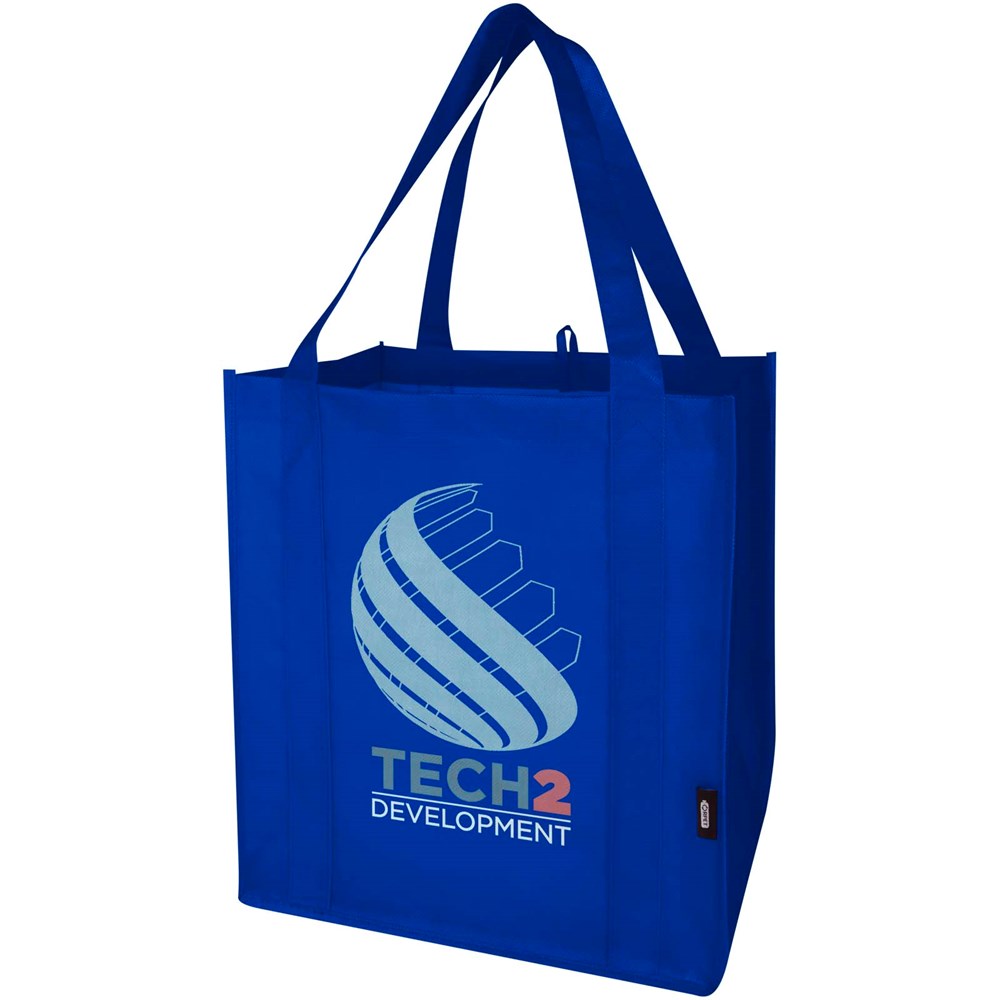 Die Liberty Tragetasche aus GRS-zertifiziertem Recyclingmaterial besteht aus strapazierfähigem und reißfestem RPET-Non Woven und verfügt über einen harten Boden, der sie vielseitig und stabil macht. Die Tasche hat ein großes Hauptfach und 25 cm lange Tragegriffe. Fassungsvermögen: 29 Liter. Beständigkeit bis zu 12 kg.