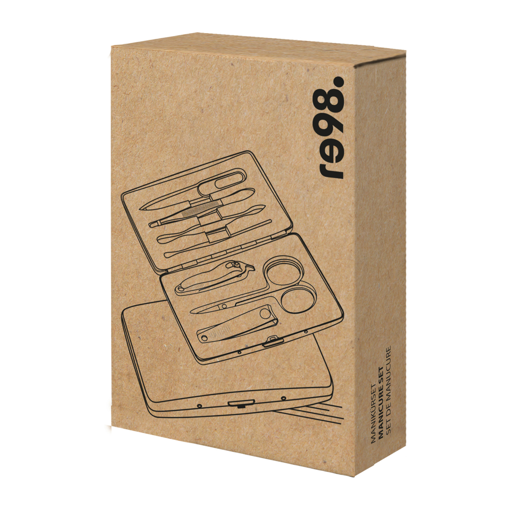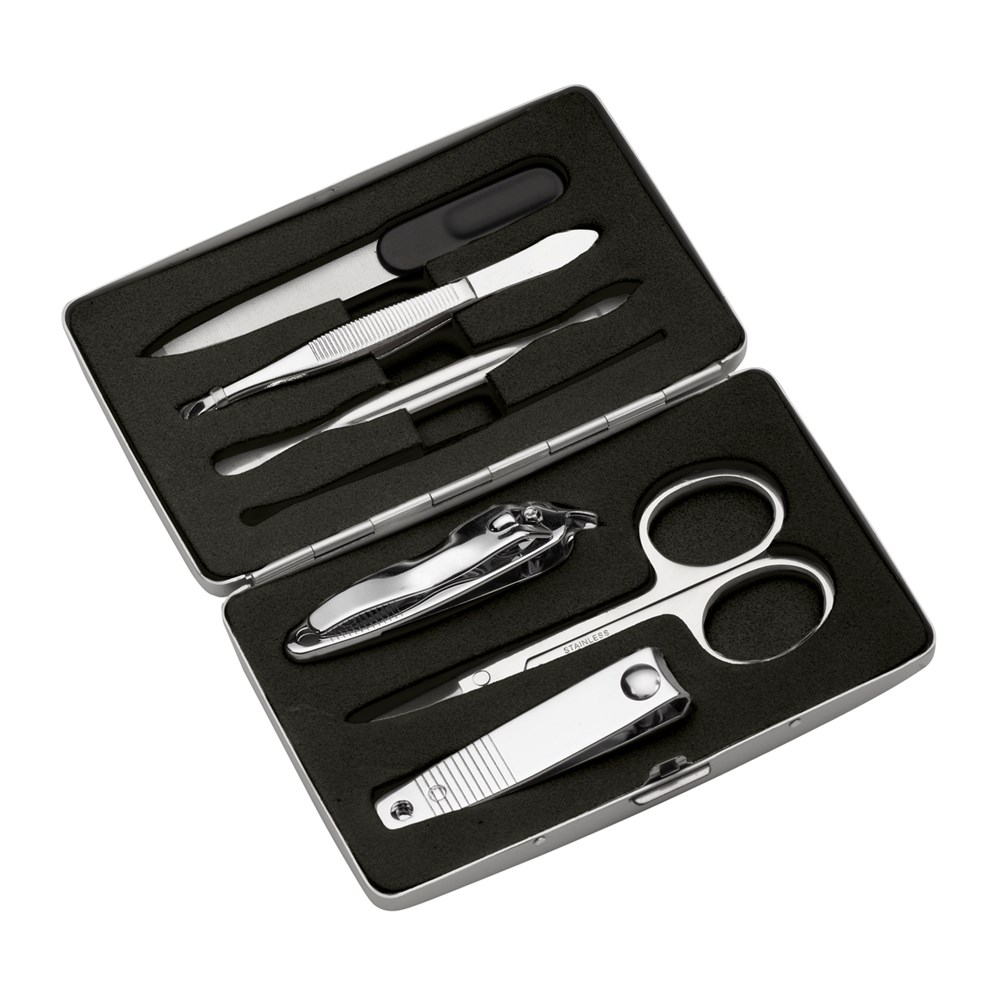 Ob auf Reisen oder zuhause, das Maniküre-Set mit sieben Utensilien zur Nagelpflege ist in einem Aluminiumetui untergebracht. Es enthält Nagelfeile, Nagelschere, Nagelknipser, Pinzette und Nagelhautschieber. Veredelbar ist das Etui mit einer dezenten Lasergravur oder einem einfarbigen Tampondruck.