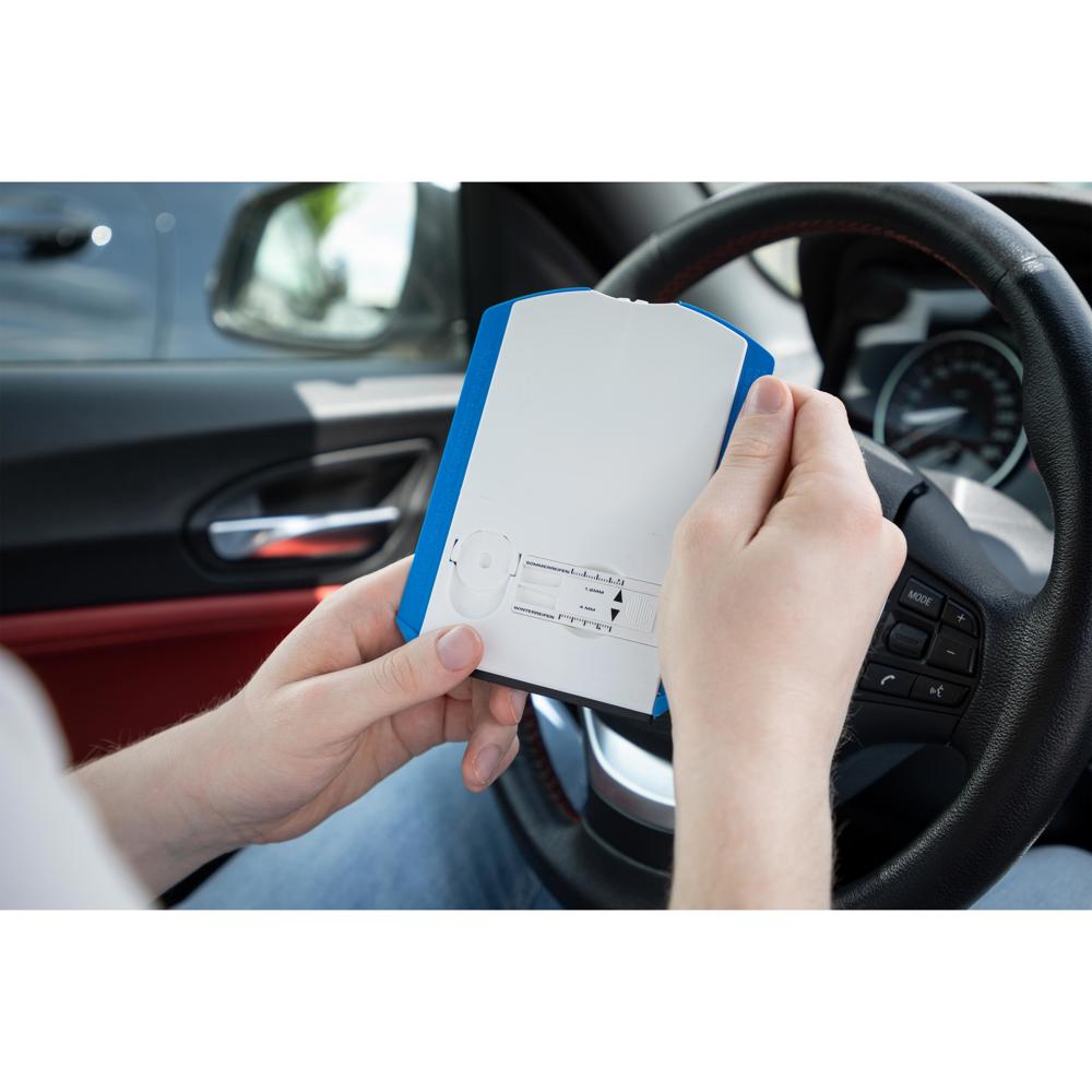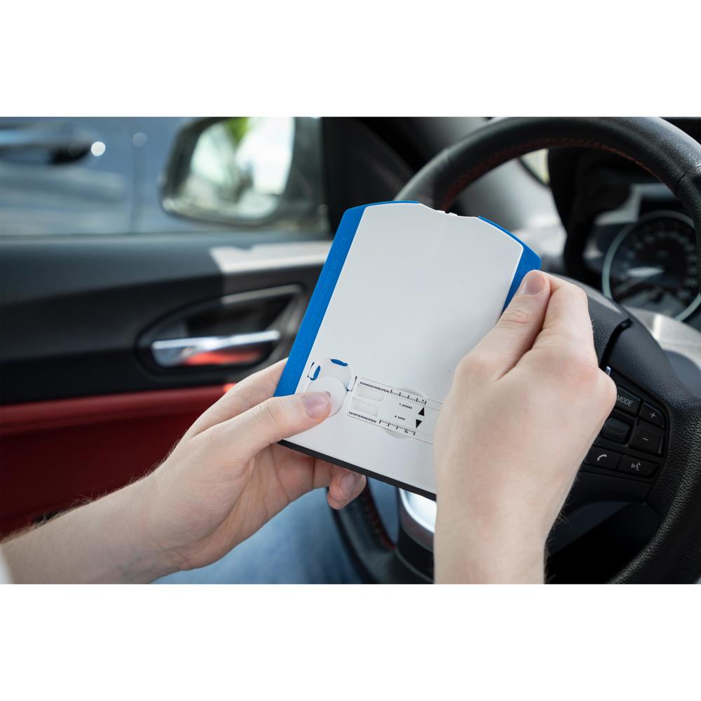Kunststoff-Parkscheibe mit glatter Kratzkante, Kratzzacken und Wasserabstreifer. Auf der Rückseite befinden sich 2 standardmäßig befüllte Halterungen für einen Einkaufswagenchip und einen Reifenprofilmesser. Entspricht Paragraph 42 StVO. Einsetzbar von -10°C bis +60°C. Auf Anfrage auch in verschiedenen Sprachvarianten erhältlich.