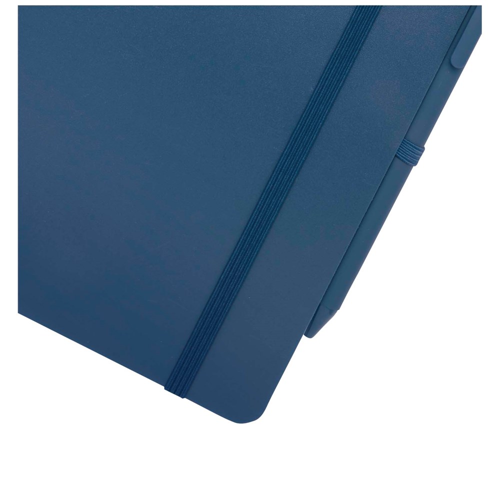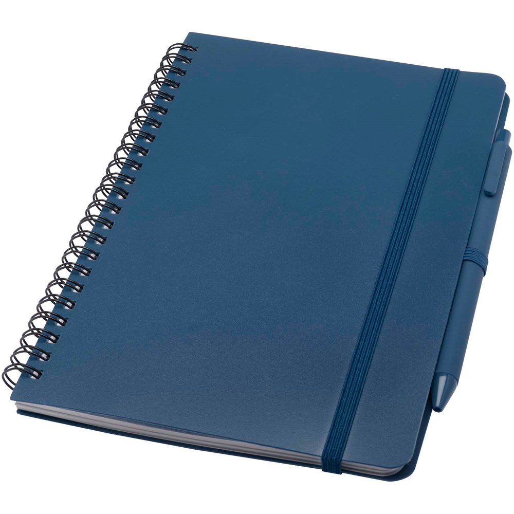 Das Thalaasa A5 Hardcover Notizbuch besteht aus recyceltem ozeangebundenem Kunststoff und umfasst 80 Blatt, liniert, aus cremefarbenem 70 g/m² Papier. Das Notizbuch hat abgerundete Ecken. Es ist mit einem elastischen Verschluss und einer Stiftschlaufe ausgestattet. Der Kugelschreiber mit schwarzer Tinte ist ebenfalls aus recyceltem, ozeangebundenem Kunststoff hergestellt. Schreiblänge: 1000 Meter. Schreibspitze: 1 mm.