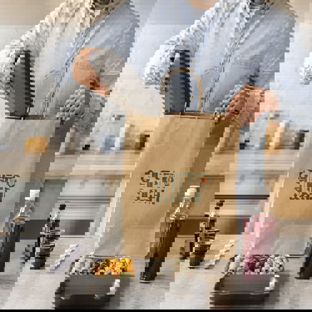 Kraftpapiertasche mit Griffen aus gedrehtem Papier. FSC-zertifiziert und in Europa hergestellt. mehr