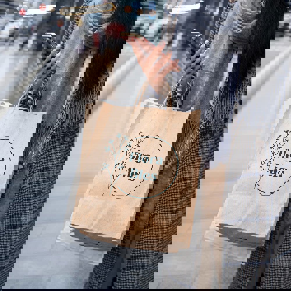 Kraftpapiertasche mit Griffen aus gedrehtem Papier. FSC-zertifiziert und in Europa hergestellt.