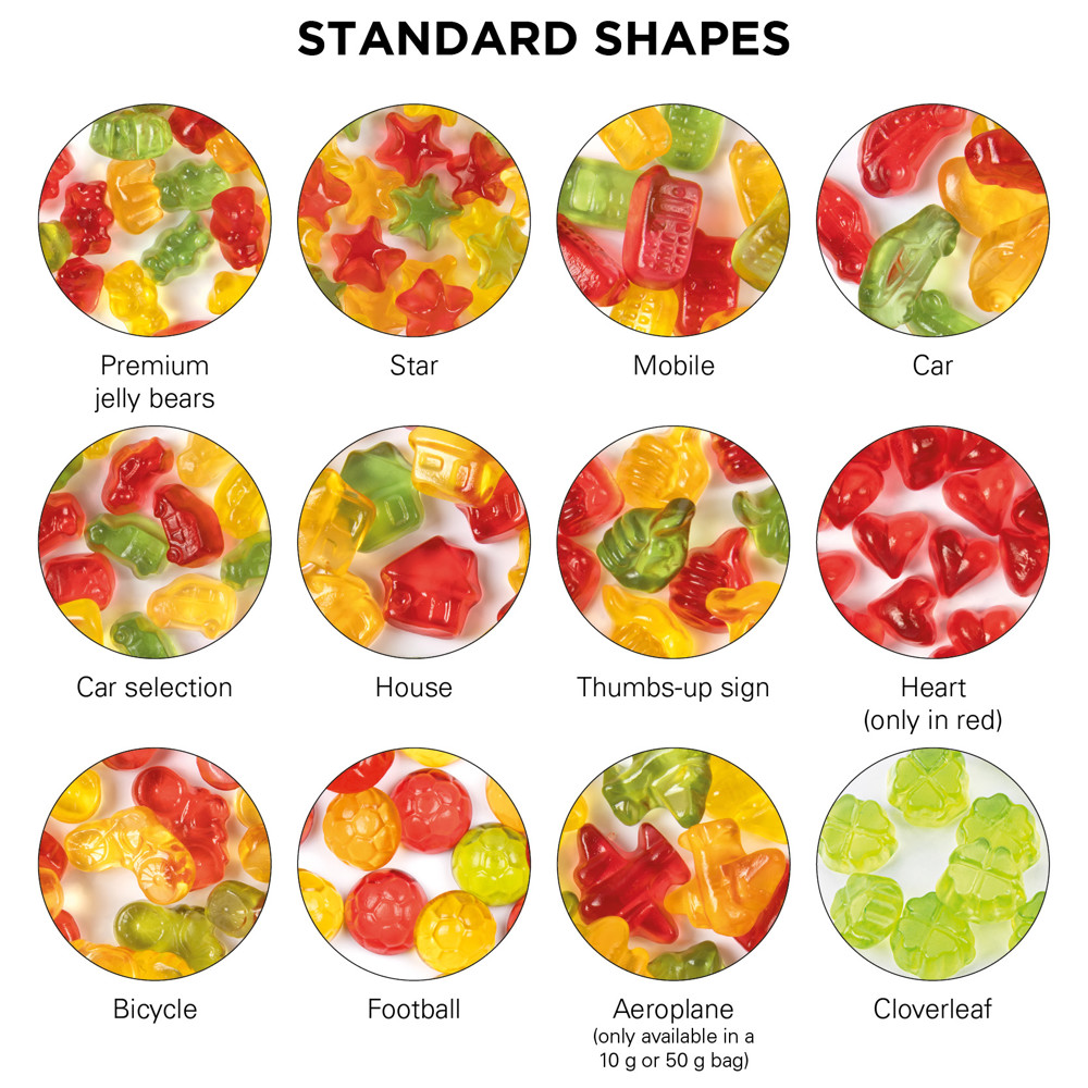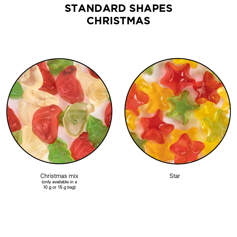 Trolli Fruchtgummi in Tüte aus weißer Folie, kompostierbar, individuell bedruckt. Inhalt: Trolli Fruchtgummi Weihnachtsmischung (Santa Claus rot und transparent & Weihnachtsbaum, grün), bunt gemischt, in Premium Qualität mit 10 % Fruchtsaftanteil, 10 g