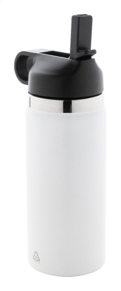 Doppelwandige Isolierflasche aus recyceltem Edelstahl mit klappbarem PP-Trinkverschluss, Tragegriff und integriertem Strohhalm. Füllmenge: 500 ml.