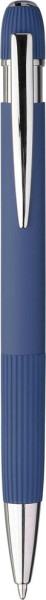 Dieser Kugelschreiber ist aus recyceltem Aluminium gefertigt und verfügt über eine gummierte Oberfläche. Er verfügt über gestreifte Details am Griff und auf der Oberseite, eine verchromte Kunststoffspitze sowie einen Druckknopf mit Metallclip. Das Recycelt-Logo ist lasergraviert. Blaue Tinte.
