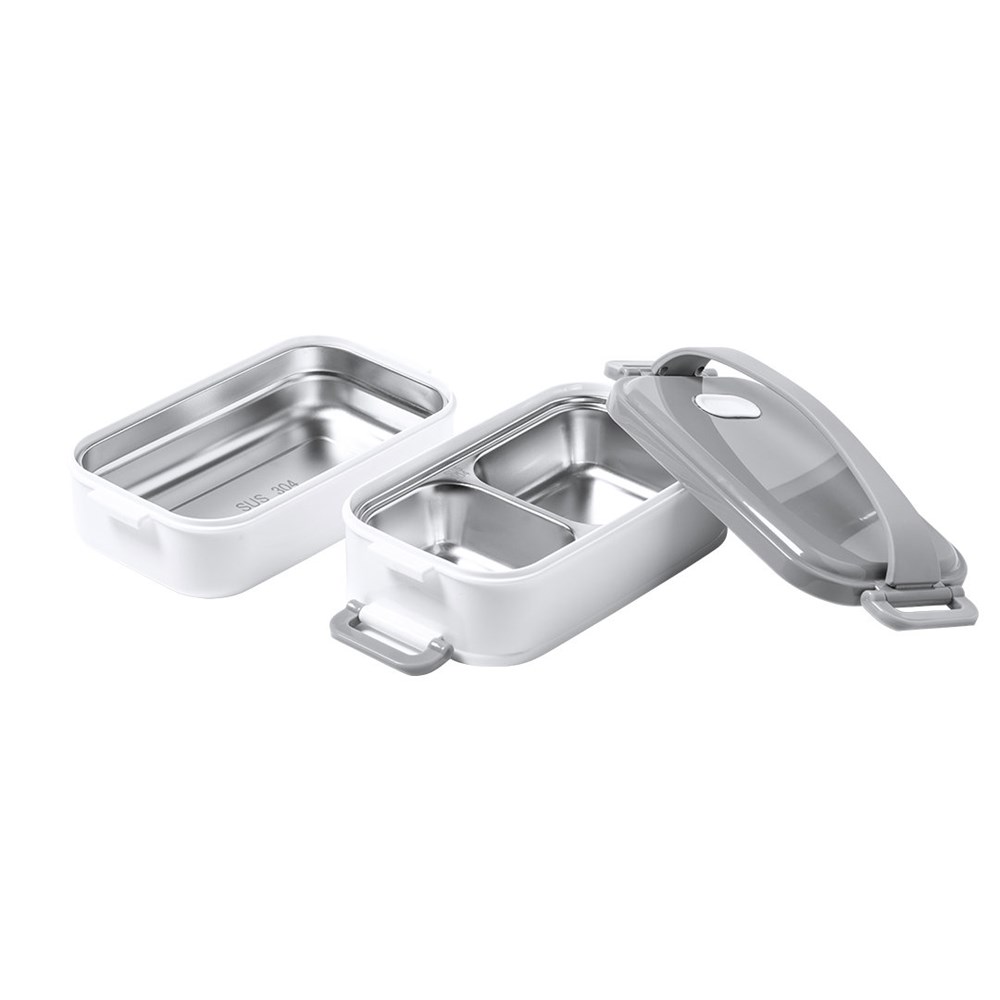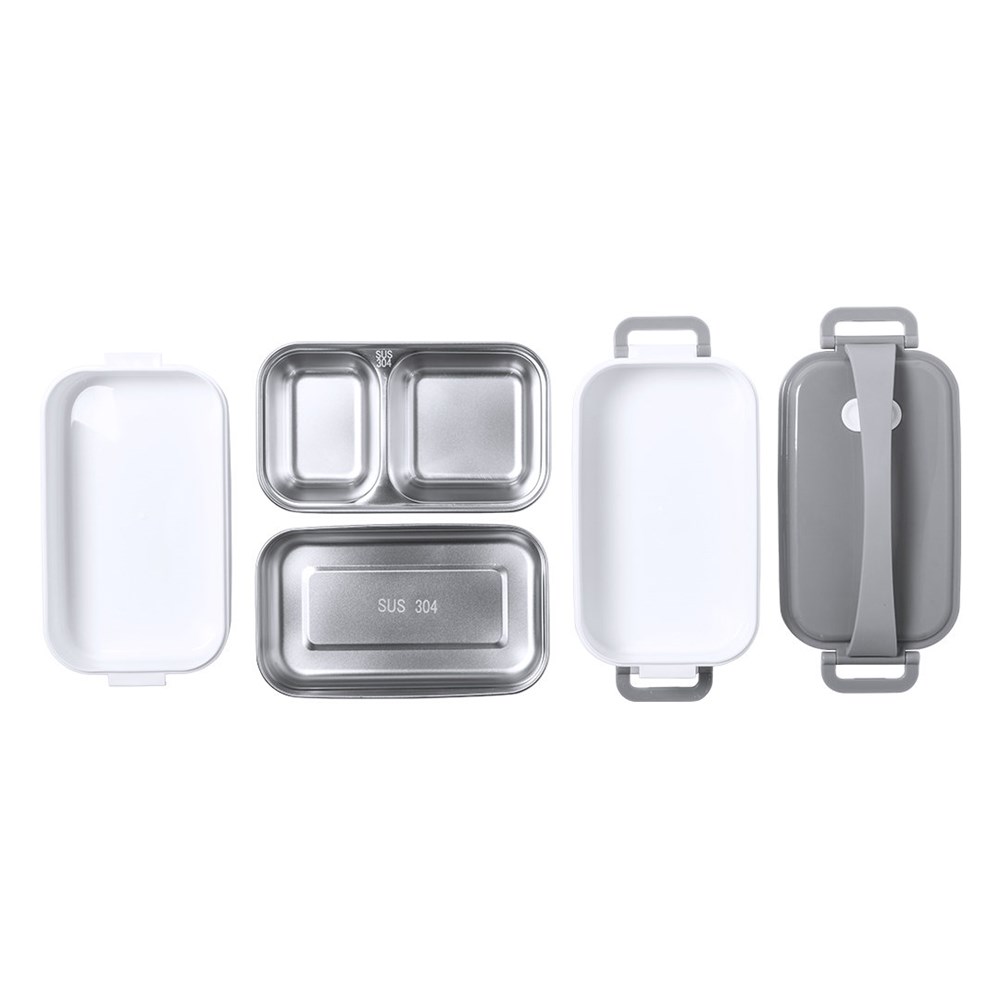Thermo-Lunchbox mit 850 ml Fassungsvermögen. Hergestellt aus rostfreiem Stahl und PP, BPA-frei. Enthält 2 unabhängige Fächer mit Edelstahlschalen und hermetischer Versiegelung, 500 ml bzw. 350 ml Fassungsvermögen. Ideal für eine gute Wärmespeicherung mit der Möglichkeit, diese durch Zugabe von heißem Wasser zu verlängern.