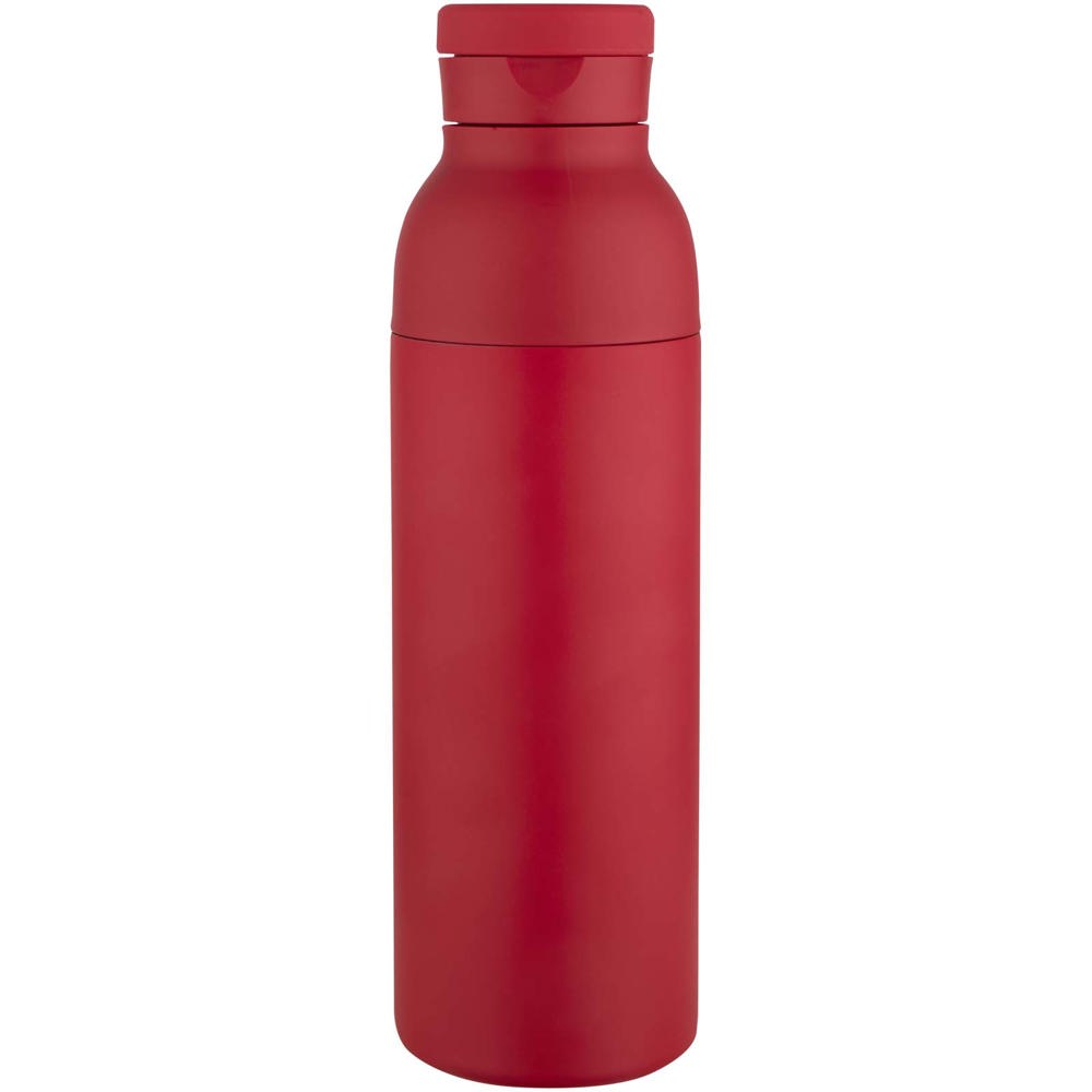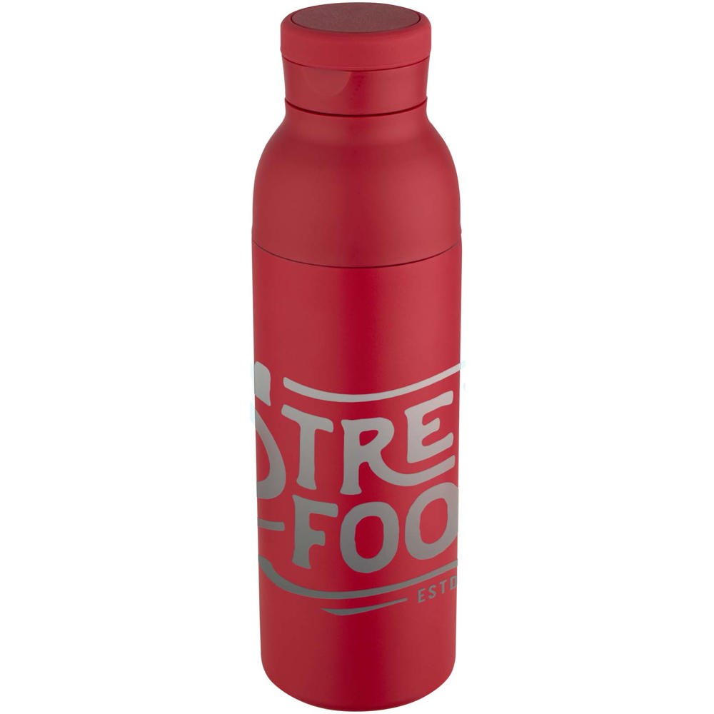 Doppelwandige, vakuumisolierte Trinkflasche aus RCS-zertifiziertem Edelstahl mit dezent integriertem Silikongriff im Deckel. Die zweiteilige Konstruktion erleichtert die Reinigung, während die widerstandsfähige Pulverbeschichtung und die Kupferbeschichtung für eine lange Lebensdauer sorgen. Verpackt in einer Geschenkbox aus Recyclingkarton. Fassungsvermögen: 650 ml.
