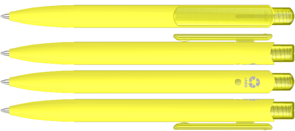 Druckkugelscheiber mit gummiertem Gehäuse aus recyceltem ABS-Kunststoff mit transparent gefrostetem Clip und Drücker. Eingelassene Griffzone.