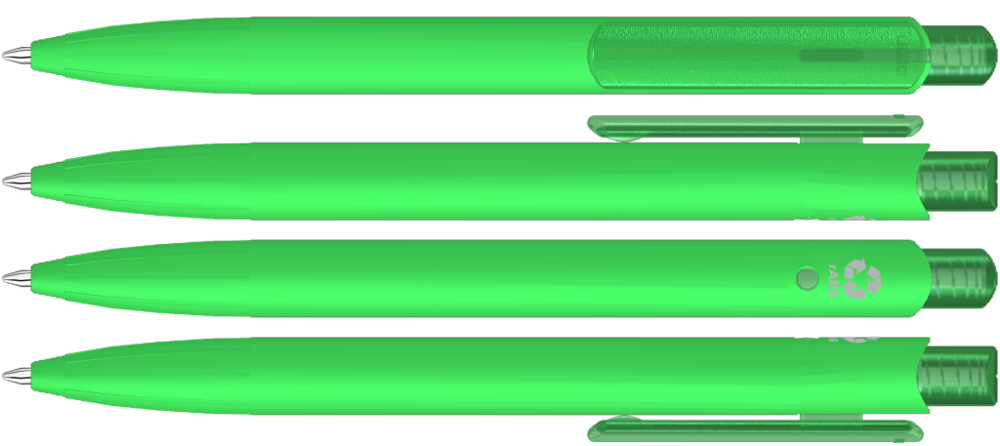 Druckkugelscheiber mit gummiertem Gehäuse aus recyceltem ABS-Kunststoff mit transparent gefrostetem Clip und Drücker. Eingelassene Griffzone.