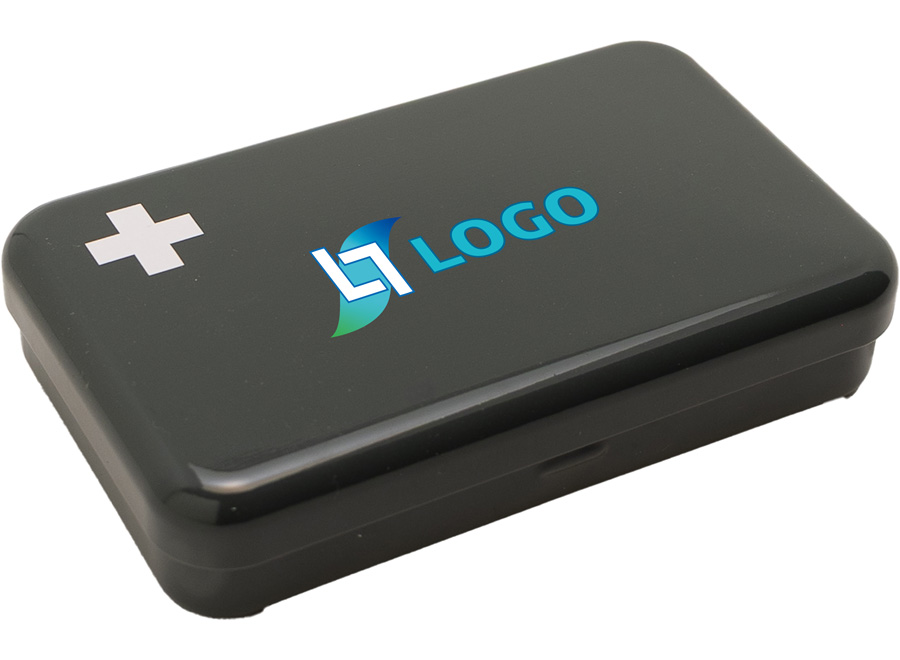 Anthrazitgraue Aluminiumdose mit folgendem Inhalt: 2 Reinigungstücher, 4 antiseptische Tücher 3 x 3 cm, 1 ?Schmetterlings?-Pflaster, 1 ?H?-Pflaster, 5 Pflaster 7,6 x 2,5 cm, 5 Pflaster 7,2 x 1,9 cm, 5 Pflaster 4 x 1 cm.