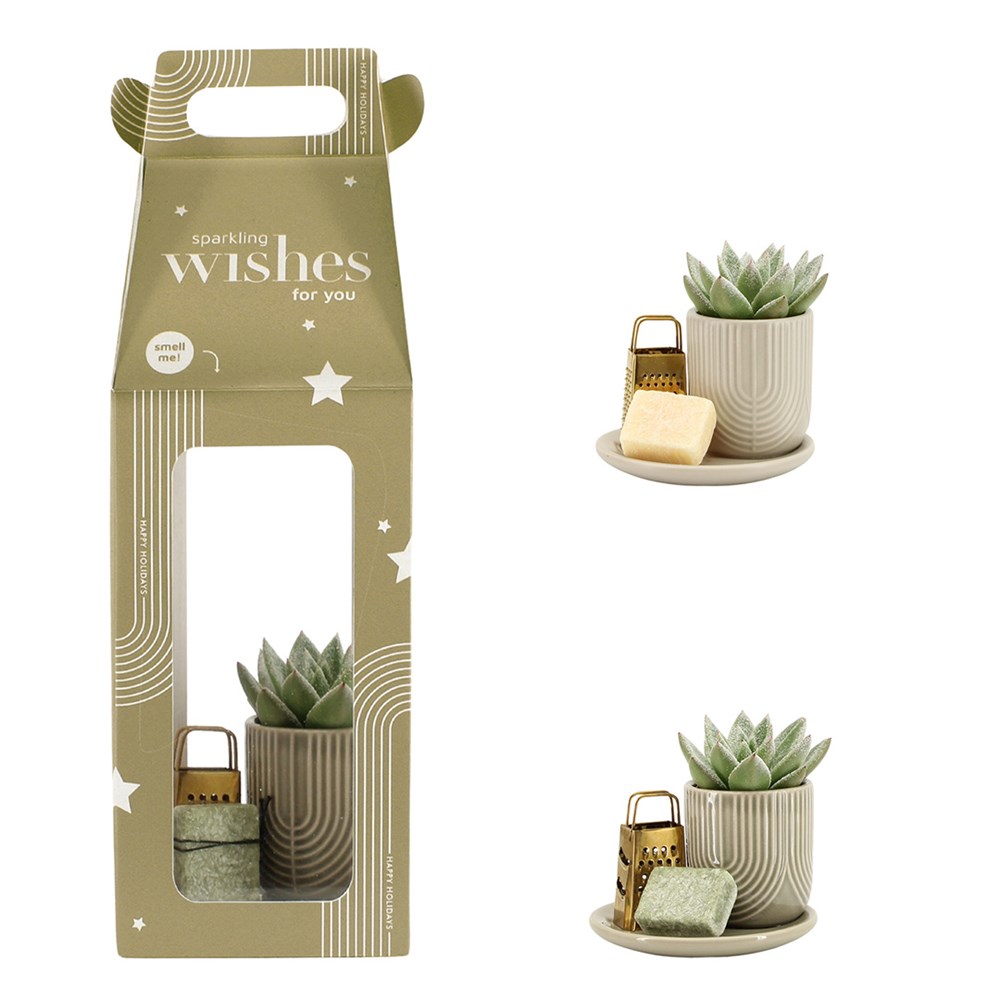 Bringen Sie einen Hauch von Weihnachtszauber mit der Aromatic Christmas Giftset small. Dieses Set vereint den Charme einer winterlichen Sukkulente mit einer festlichen Botschaft: „Sparkling wishes for you“. Das Set umfasst ein stilvolles Tablett, eine Sukkulente in einem Keramiktopf, ein Bernstein-Duftblock und einen passenden Schaber. Die Verpackung hat eine Weihnachtsgrüße und macht das Geschenk zu etwas ganz Besonderem für die Feiertage.