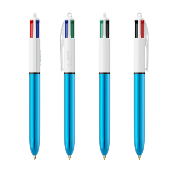 Der BIC® 4 Colours® in glänzenden Metallic-Farben. Enthält vier Standard-Farbtinten: Blau, Schwarz, Rot und Grün. Unser legendärer BIC® 4 Colors® wird nachhaltiger, jetzt mit 13 % weniger Kunststoff im oberen Bereich!