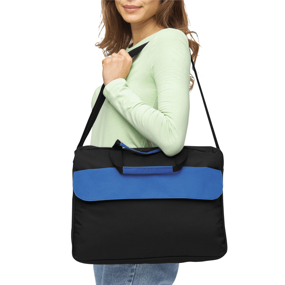 Dokumententasche BRISTOL: Klettverschluss-Vorfach mit farblich abgesetztem Umschlag, geräumiges Reißverschluss-Hauptfach, 2 verstärkte und farblich abgesetzte Tragegriffe, verstellbarer Schultergurt