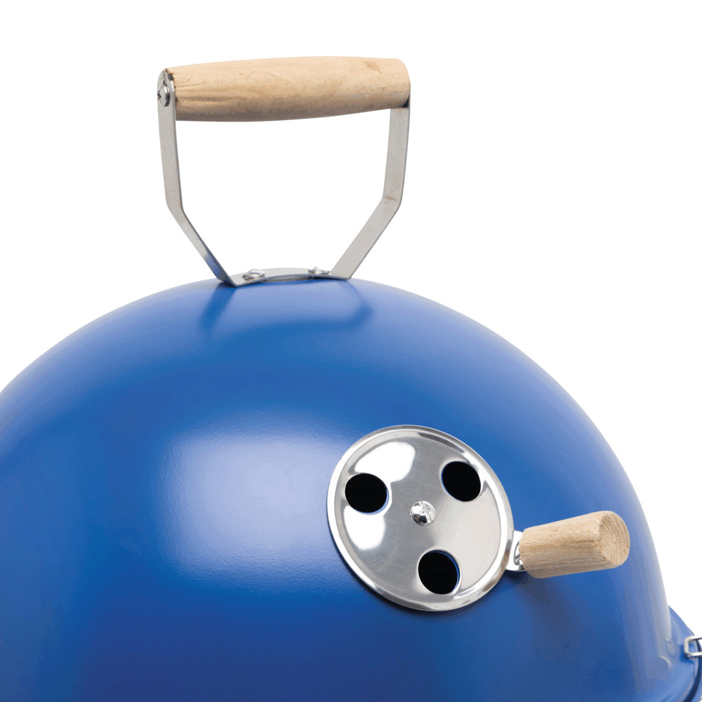Kugelgrill COOKOUT: Metall-Korpus mit 2 Belüftungsfenstern, herausnehmbare Schale mit Luftlöchern für Kohle, herausnehmbarer Grillrost Ø ca. 29 cm, Garhaube mit Belüftungsfenster und Holzgriff, 3 Schnappverschlüsse zum Befestigen der Haube am Metall-Korpus, 3 Metallfüße mit Kunststoffkappen, in Box