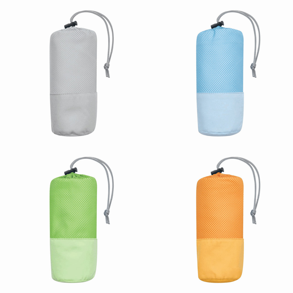 Mikrofaser-Handtuch FRESHNESS: saugstark und schnelltrocknend, mit weicher Oberflächenstruktur, in farblich passender Netztasche mit Zuziehband und Kunststoffstopper
