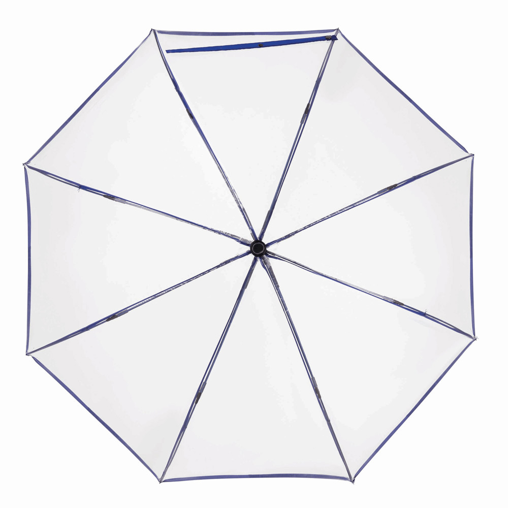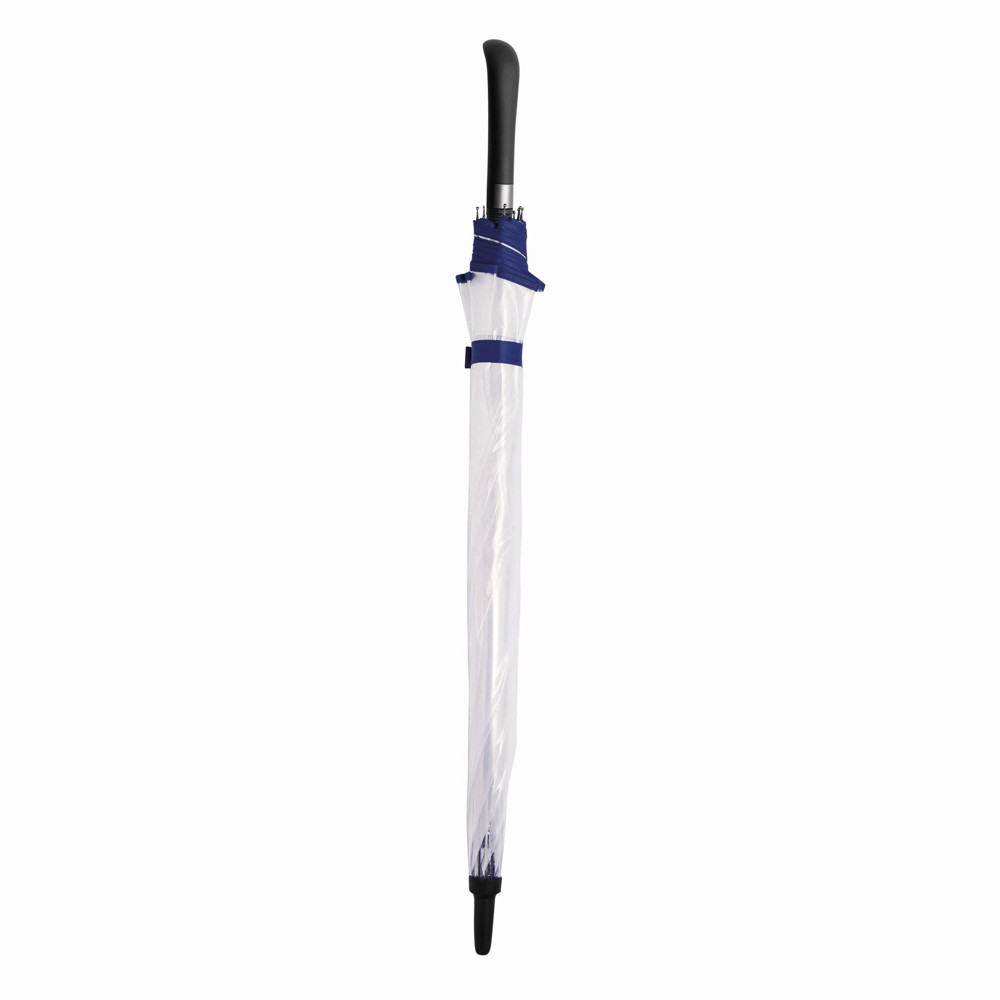 Automatischer Windproof-Stockschirm VIP: Metallstock, farbige Fiberglasspeichen mit Metalltips, Kunststoffspitze, Kunststoffgriff mit integrierter Auslösetaste, transparente POE-Bespannung mit farbiger Paspelierung, Schließband mit Druckknopf