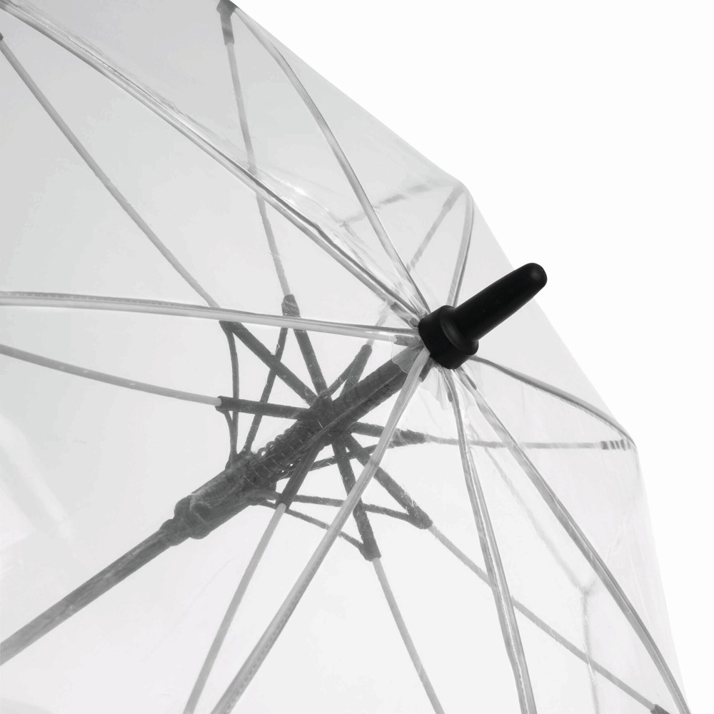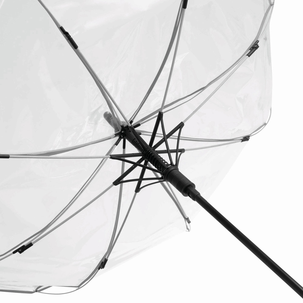 Automatischer Windproof-Stockschirm VIP: Metallstock, farbige Fiberglasspeichen mit Metalltips, Kunststoffspitze, Kunststoffgriff mit integrierter Auslösetaste, transparente POE-Bespannung mit farbiger Paspelierung, Schließband mit Druckknopf