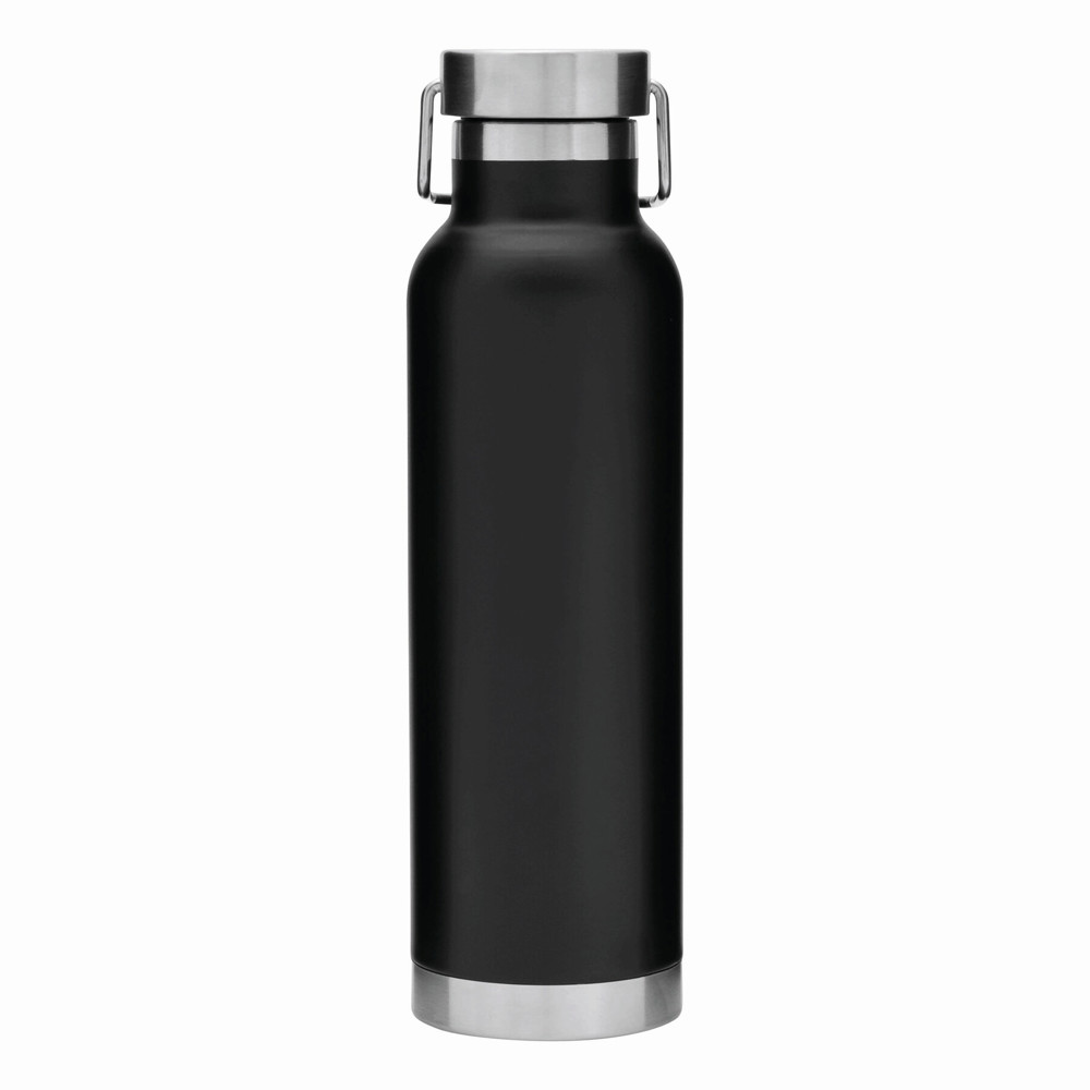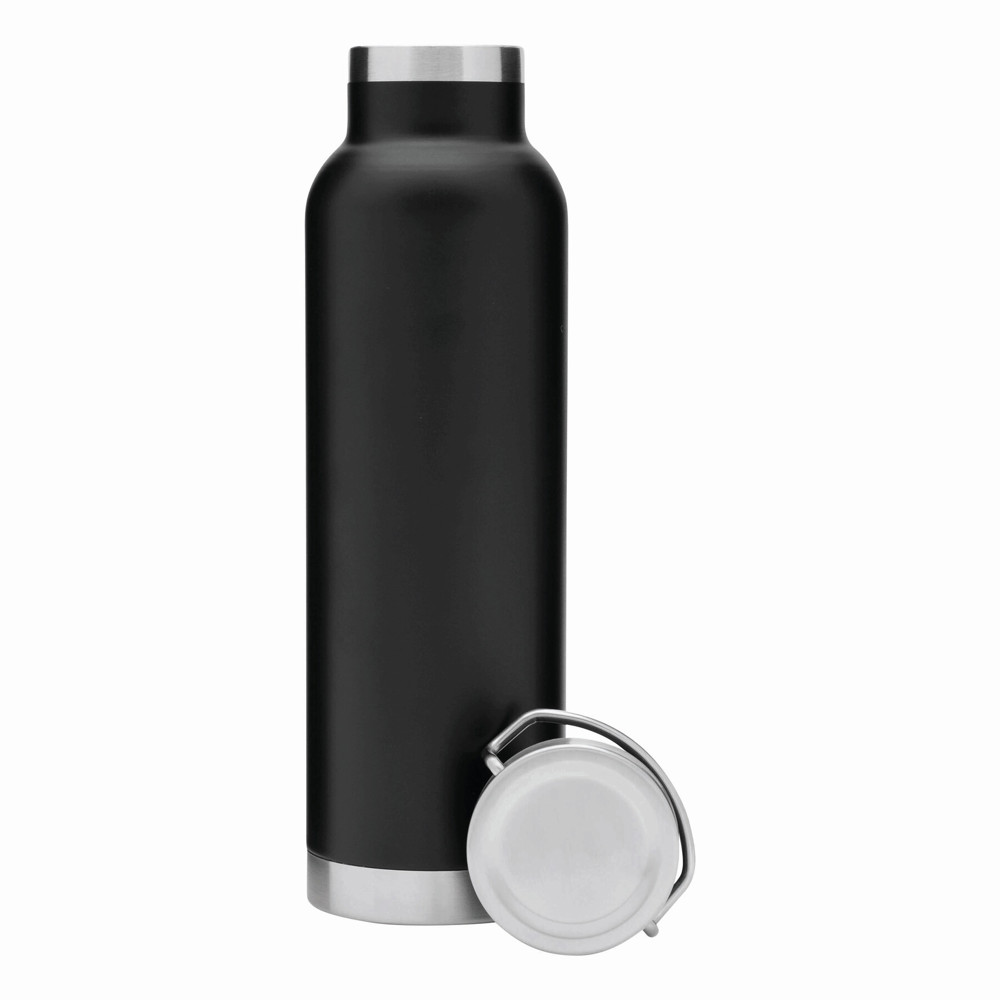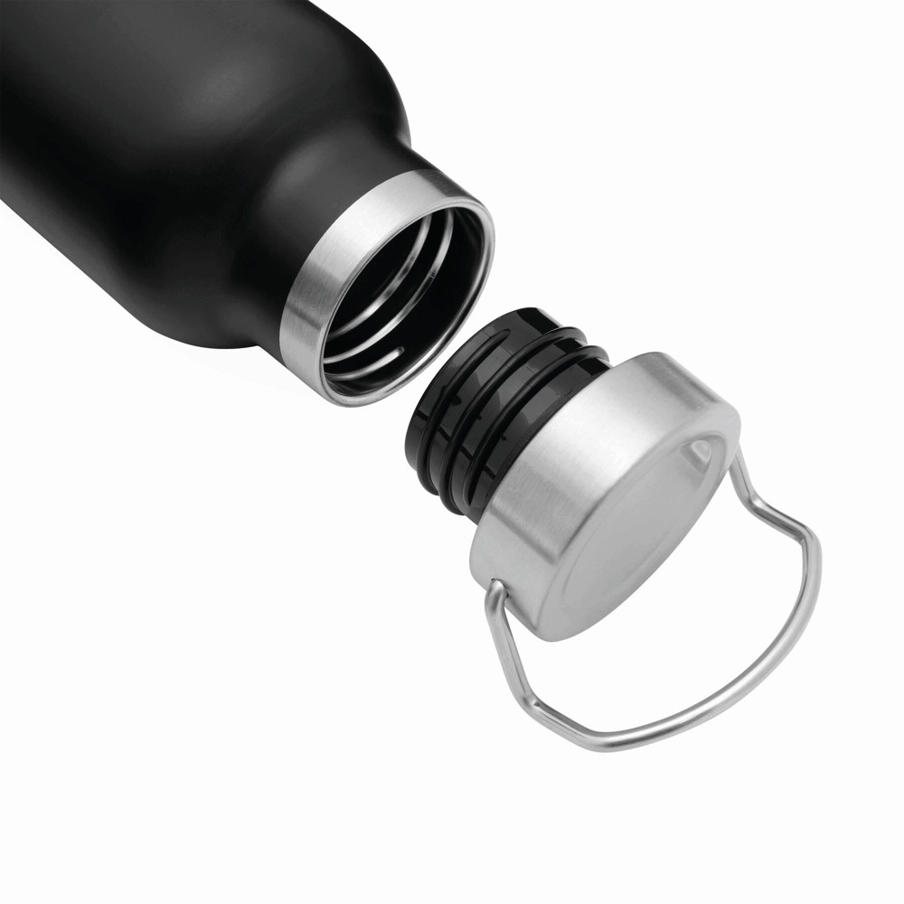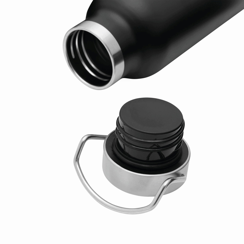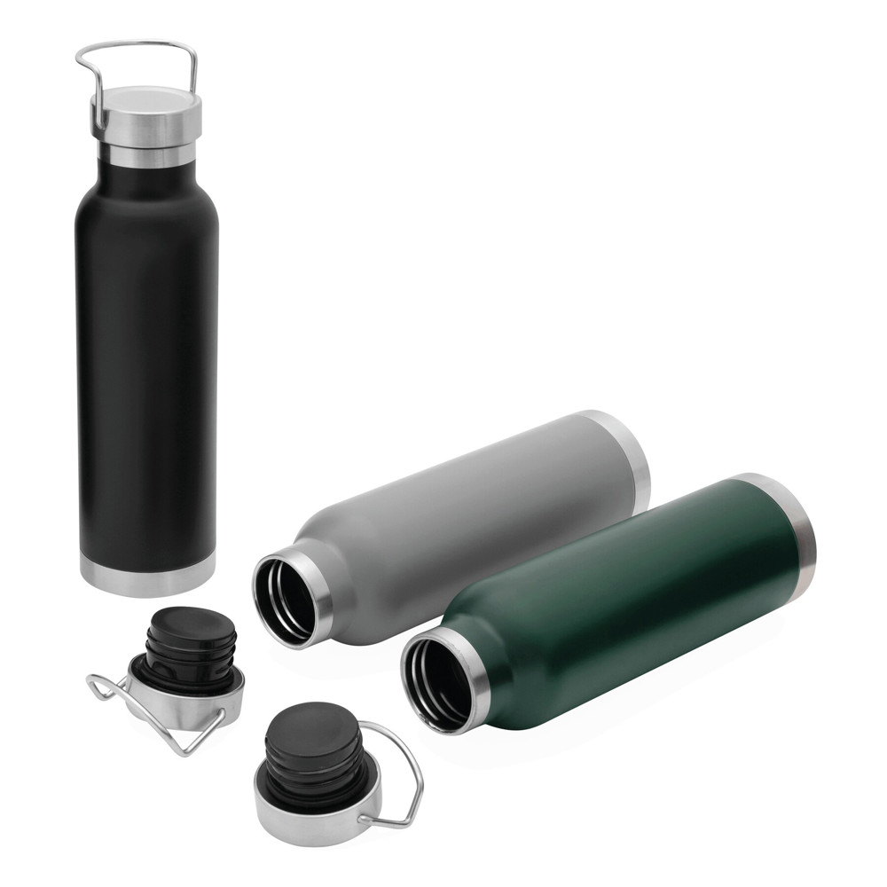 Vakuum-Isolierflasche MILITARY, doppelwandig: mit Kupfer-Isolierung, innen und außen aus Edelstahl, silberner Deckel mit Schraubverschluss, Silikon-Dichtring und Tragegiff, Füllmenge ca. 650 ml, hält ca. 12 Stunden warm und bis zu 24 Stunden kalt, in Box