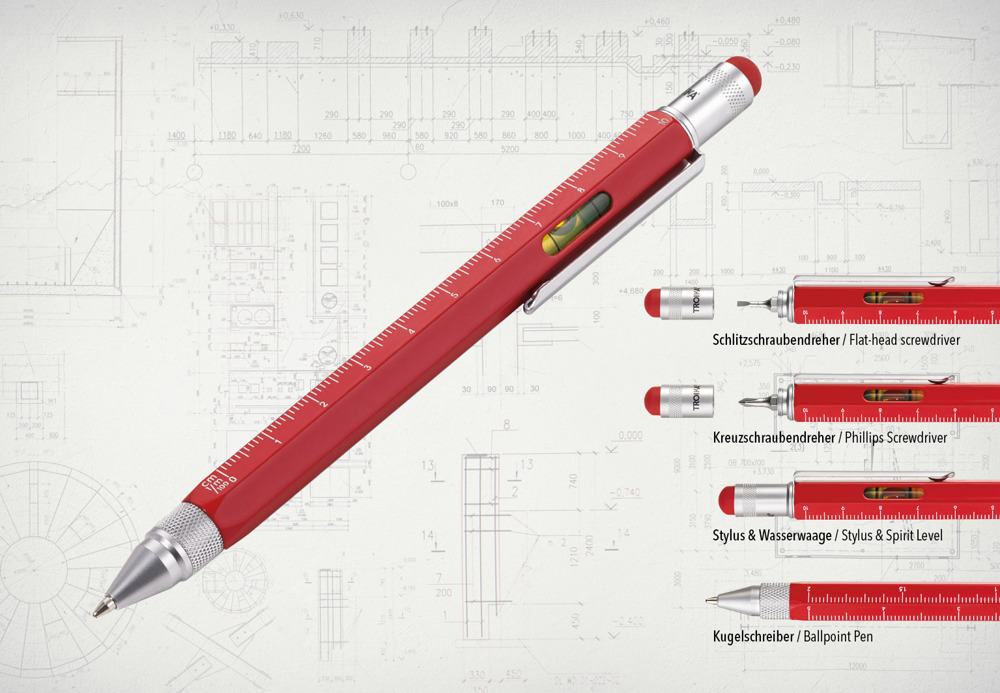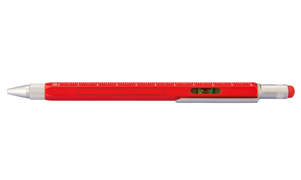 Multitasking-Kugelschreiber, Zentimeter/Zoll-Lineal, 1:20 /1:50 Skala, Wasserwaage, Schlitz-/Kreuzschraubendreher, Stylus, schwarze Mine, Messing, lackiert, rot/silberfarben