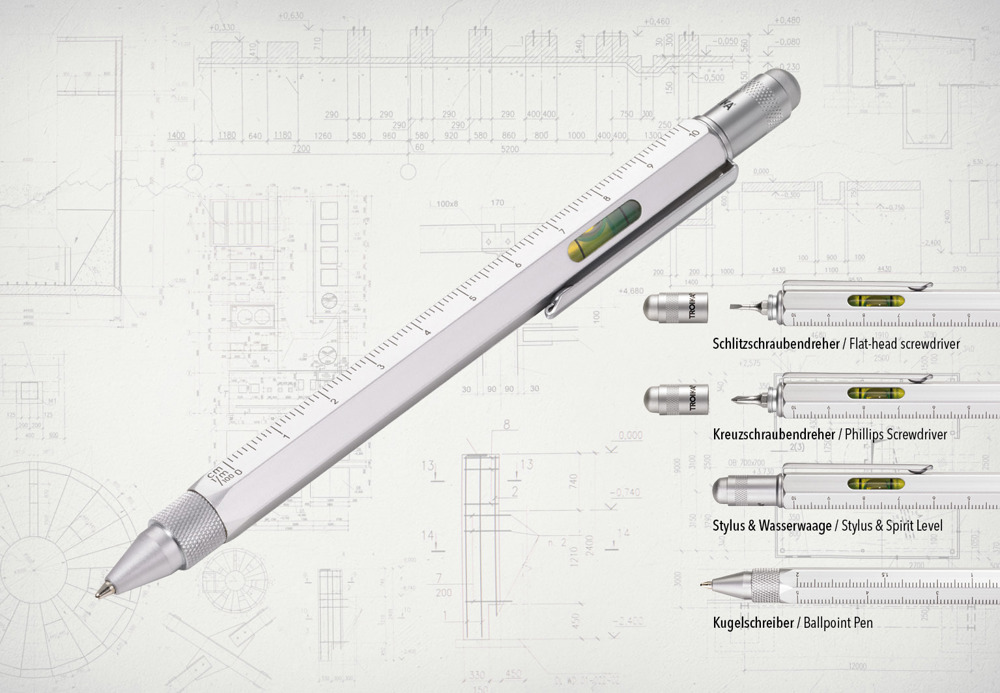 Multitasking-Kugelschreiber, Zentimeter-/Zoll-Lineal, 1:20/1:50 Skala, Wasserwaage,... mehr