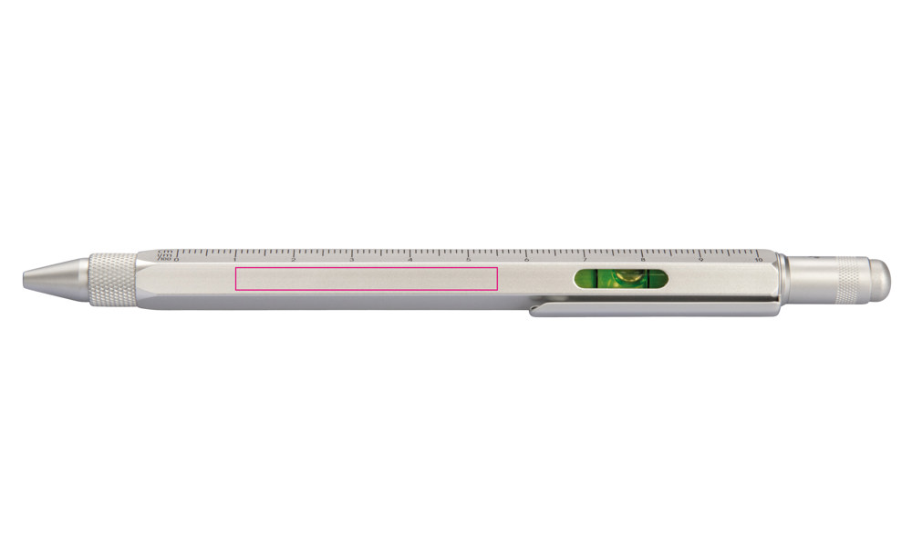 Multitasking-Kugelschreiber, Zentimeter/Zoll-Lineal, 1:20 /1:50 Skala, Wasserwaage, Schlitz-/Kreuzschraubendreher, Stylus, schwarze Mine, Messing, lackiert, silberfarben