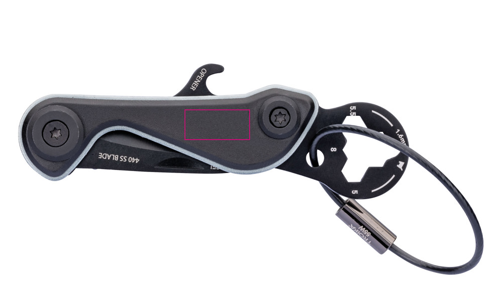 Mini-Werkzeug mit 9 Funktionen, Einkaufswagenlöser, Paketmesser + Klinge aus 440 Edelstahl mit Einrastfunktion, Schlüsselanhänger (Drahtschlaufe), Flaschenöffner, Sechskantschlüssel (3 Größen), Reifenprofiltiefenmesser (1,6 mm), 440 Edelstahl, Aluminium, eloxiert, schwarz/titanfarben